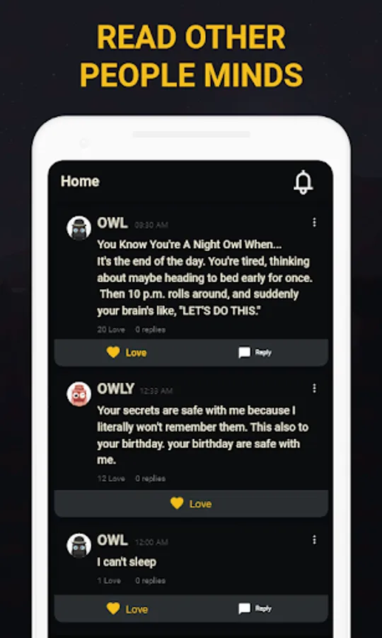 Owls is an online community for night owls where people share real night thoughts, trade advice and tell their day story anonymously.