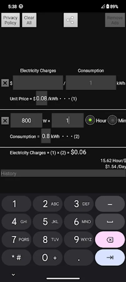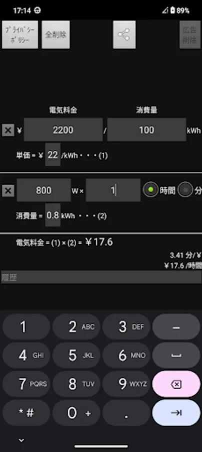 Electricity bill calculator free app that calculates electricity charges from electricity rate unit price and usage (kWh per kilowatt hour). Time calculation per unit price (seconds, minutes, hours, days, weeks) and price calculation per unit time. For grasping, managing and saving electricity bills.