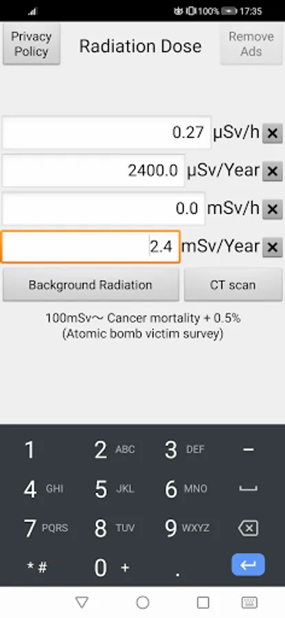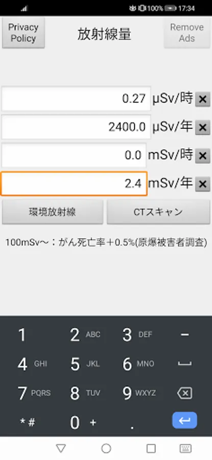 A radiation measurement value conversion application that converts the radiation measurement value per hour by a radiation measuring instrument into annual radiation dose and converts the annual radiation equivalent unit Sievert into per hour. Milli-sievert (mSv), micro-sievert (μSv), environmental radiation dose, CT scan radiation dose display.