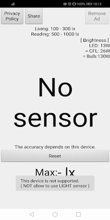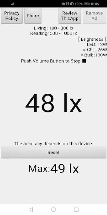Easy luminometer lux meter free app to measure brightness (lx) using illuminance sensor. Start / stop of measurement and sharing the measurement value. Luminometer availability / illuminance measurement accuracy depends on your device.