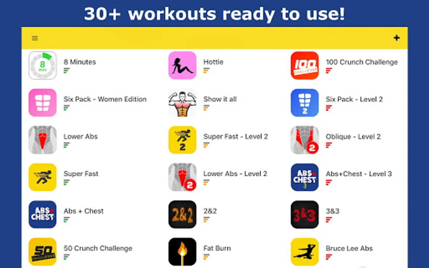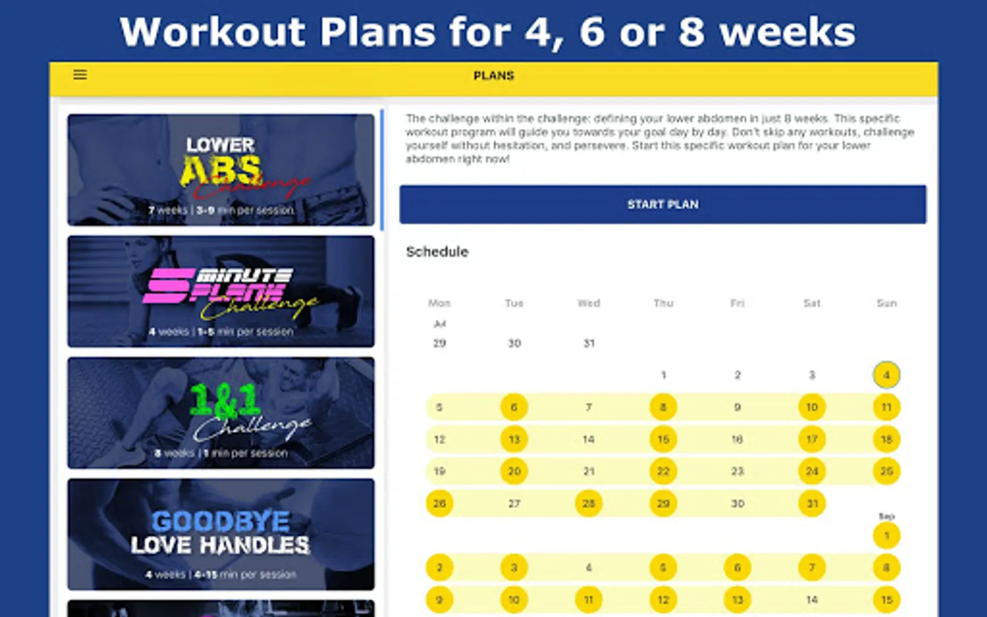 A plan is a set of ever-changing workouts that lead you to achieve a specific goal within a given time period as if you were guided by a real personal trainer.