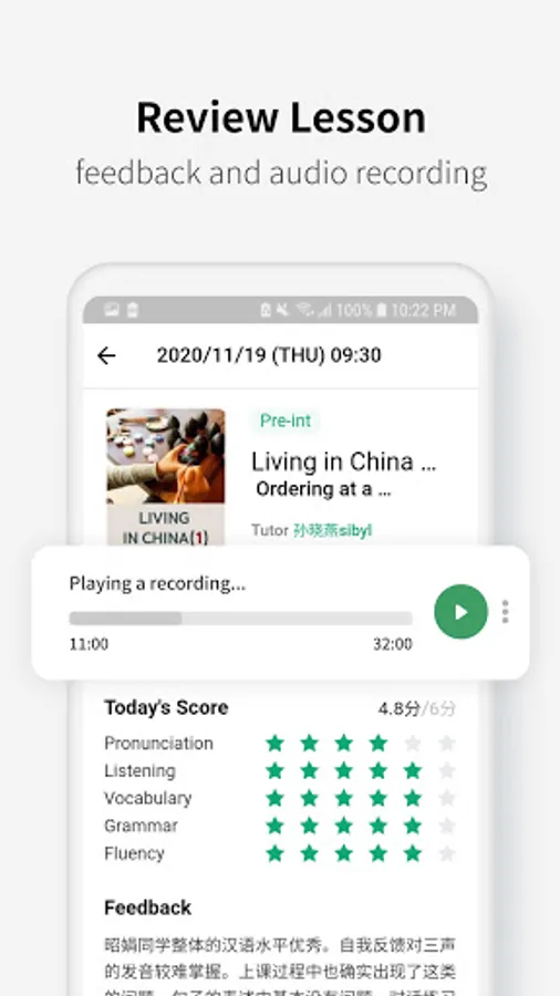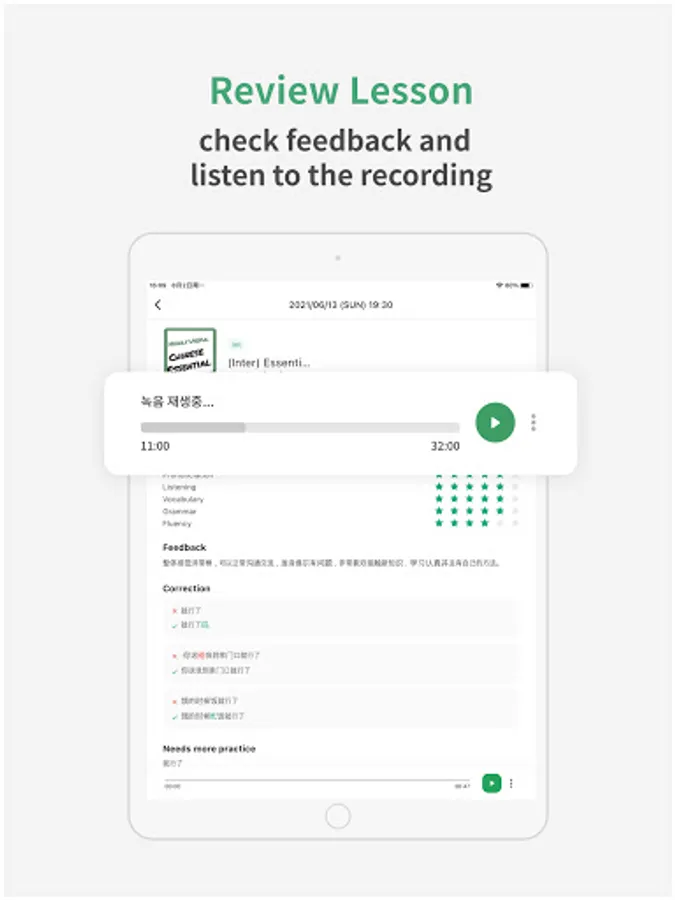 Listen to lesson recordings and review with recommendations for improving after each lesson.