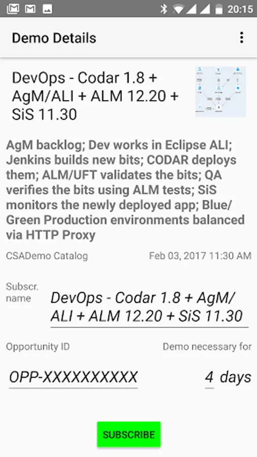 Hewlett-Packard Enterprise is running a demo platform called Stratus. It enables HPE pre-sales and partners to show live as well as recorded demos of HPE products. This client allows all Stratus users to subscribe for new demos and extend share or cancel the existing ones from Android running cell phone or table. It also enables users to manage VMs belonging to particular demos.