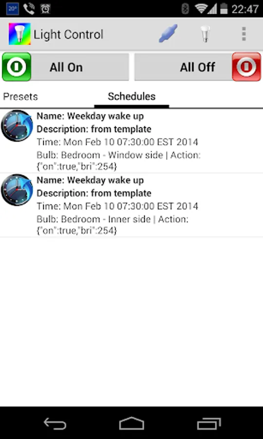 When you want to change the lights based on time mood, multiple presets can be executed at the same time if they don't have bulbs in common. If bulb in common exist the last activated preset will be the active one.
