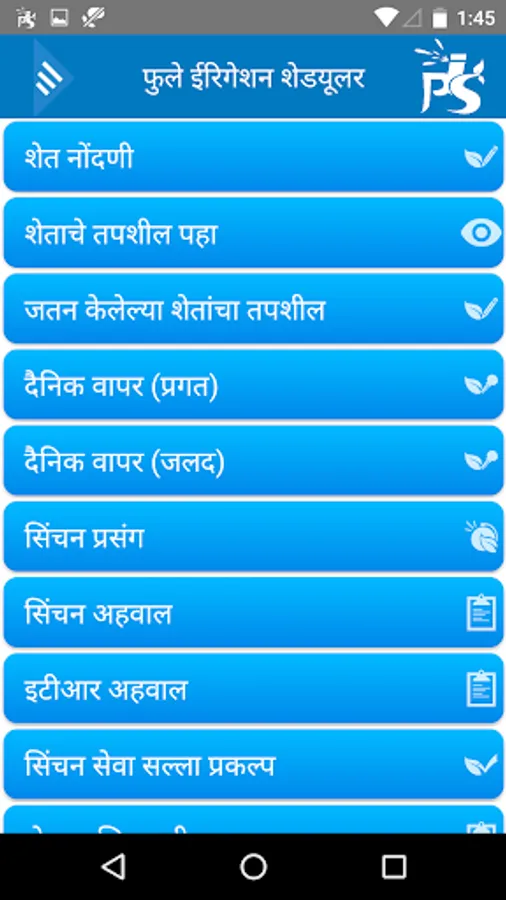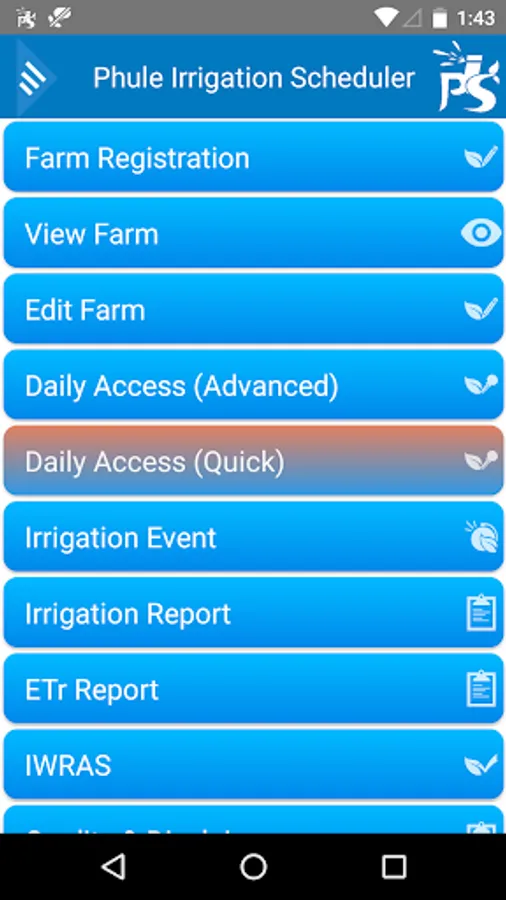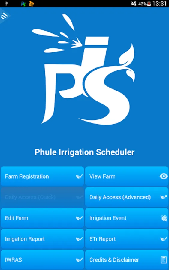 “Phule Irrigation Scheduler” (PIS) mobile app provided by Rashtriya Krishi Vikas Yojana (RKVY), Irrigation Water Requirement Advisory Service (IWRAS), Mahatma Phule Krishi Vidyapeeth,Rahuri is for illustrative purposes only which provides farmers, scientists and users, irrigation scheduling and time of operation. This mobile app is supplied "AS IS" without any warranties and support. IWRAS assumes no responsibility or liability for the use of this mobile app, conveys no license or title under any patent, copyright, or mask work right to the product. RKVY-IWRAS, MPKV, Rahuri reserves the right to make changes in this app without notification.