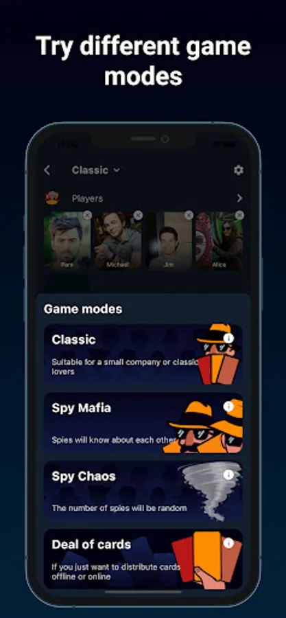 You will be able to create online distributions, receiving a code by which other players will connect, choose the number of players, the number of spies and the leader, add or remove hints, set a timer to control the time of a round or a move, and add roles that affect the player's behavior in the course of the game.
