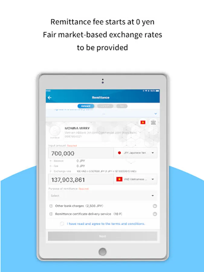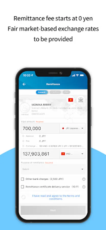 Free of charge when sending a large amount remittance (e.g., over 5,000 USD), and we provide real & transparent exchange rate.