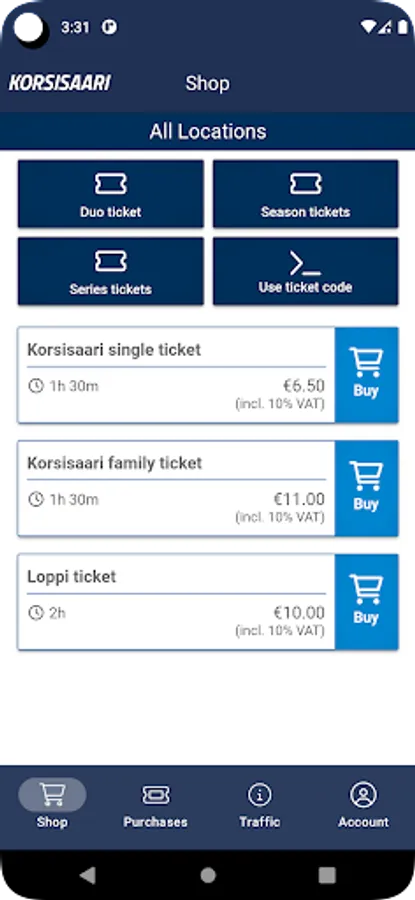 With Korsisaari app it’s easy to buy tickets for public transport operated by Korsisaari companies. You can buy single, multi and season tickets. You can purchase Duo tickets that are also valid in HSL (Helsinki public transport) area.