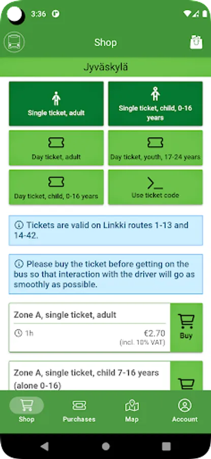Tickets are valid in Jyväskylä region’s public transport in Linkki routes 1–13 and 14–42 in Jyväskylä, Laukaa and Muurame regions.