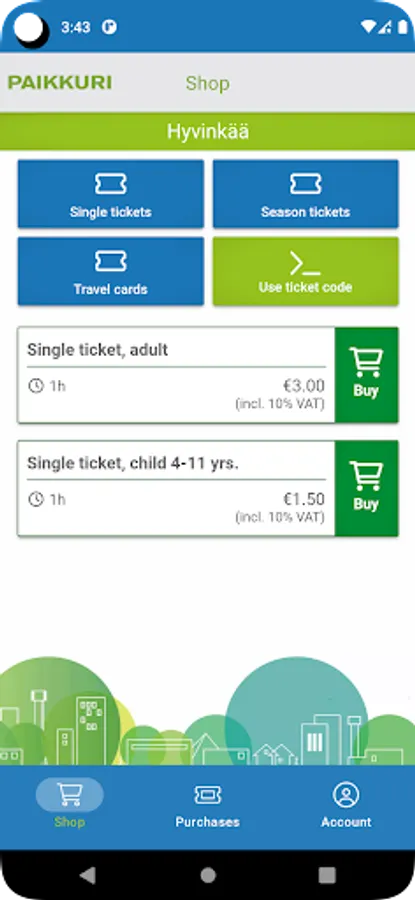 With Paikkuri app it’s easy to buy Hyvinkää public transport tickets. You can buy single and season tickets and travel cards. You can also purchase various combination tickets for Hyvinkää public transport and routes operated by Ventoniemi. You can use all the most popular digital payment methods.