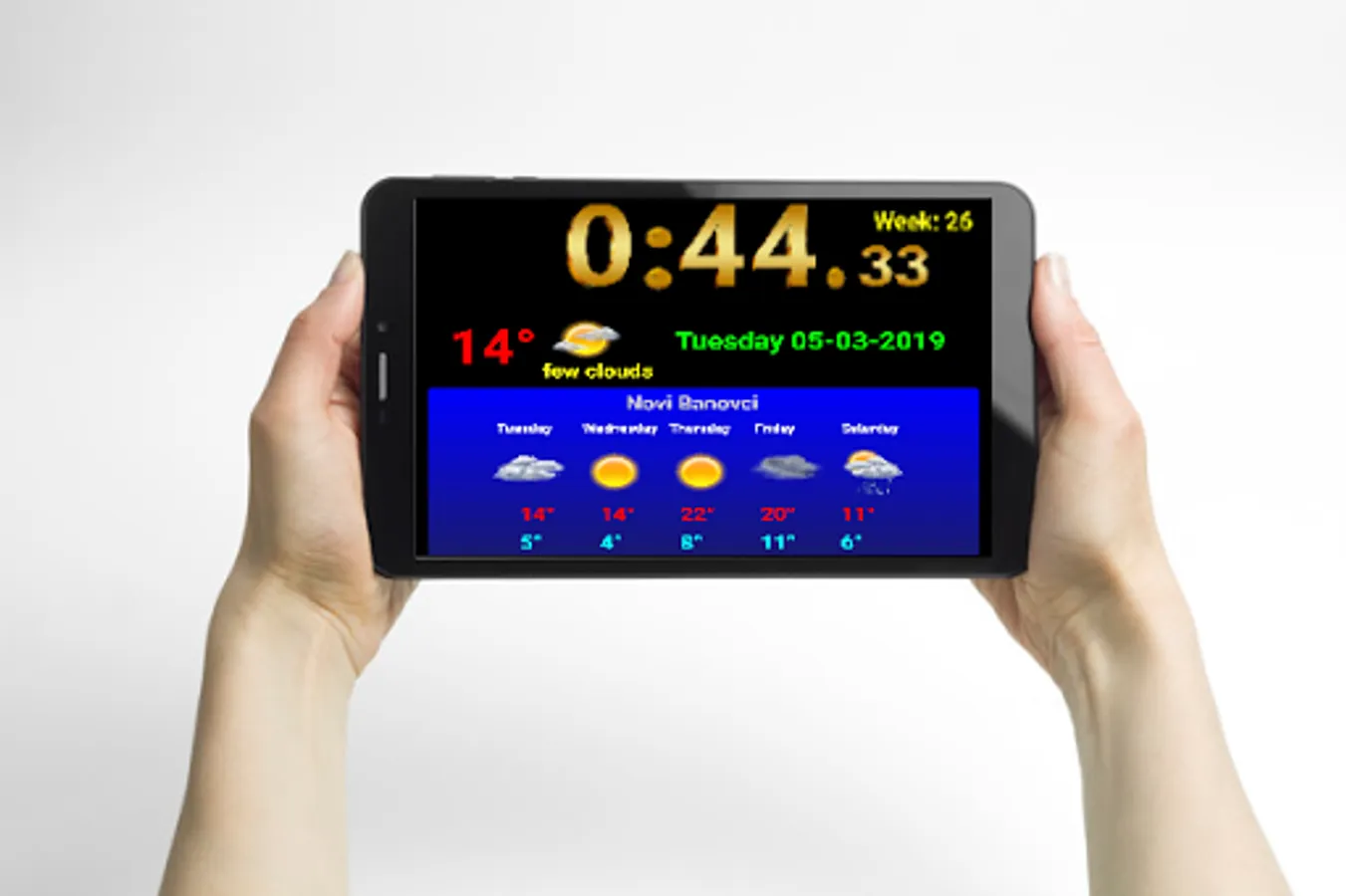 Use your old phone tablet as a wall clock with clock and weather station. The reading of the information is always easy to read during the day or at night.