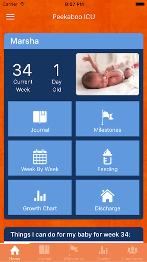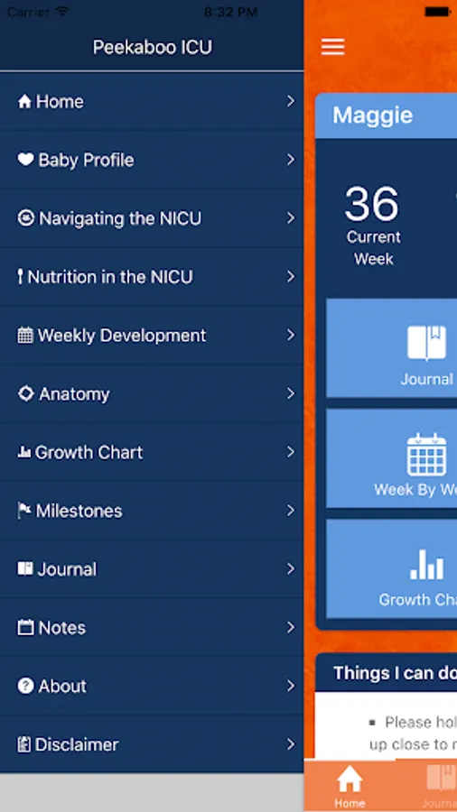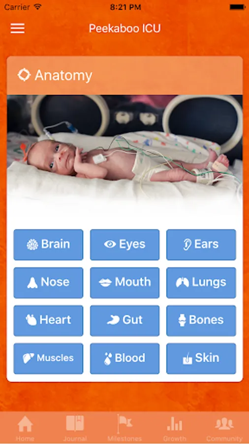 The Peekaboo ICU PREEMIE app is packed full of features and broken down into organized and easy to navigate sections including: