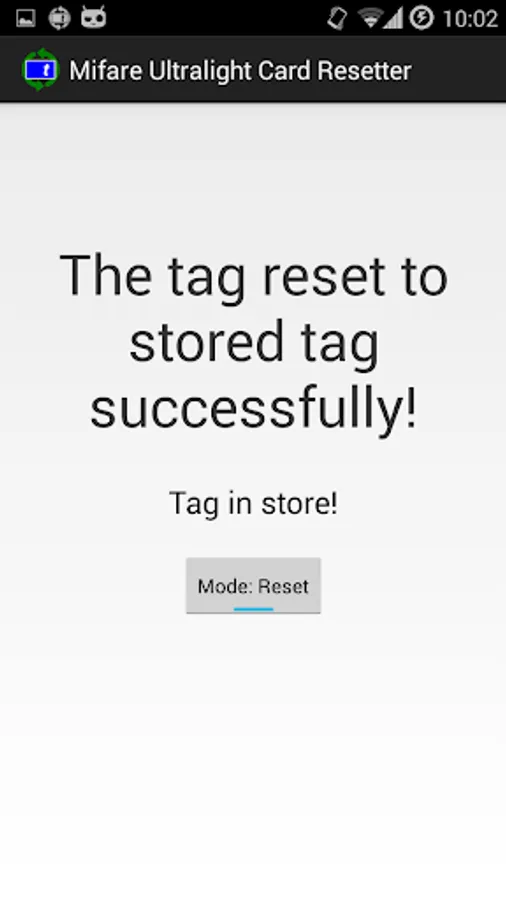 This simple app allows you to reset a MIFARE Ultralight® Type A (Or the first part of a Type C) tag to a set default. Scan to tag once to set, then set the app to reset mode. Each consecutive time you touch the tag it will reset the unlocked pages to what they where. You can also leave the app closed and touch the phone, the app will still recognize the tag and reset it.