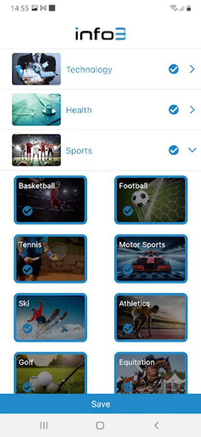 Pick the categories you want to receive news from and dive deeper into the subcategories to specify what your interests are, for example, chose the all sports category to be informed about all sports news or pick the football and basketball category to receive news only from these 2 categories.