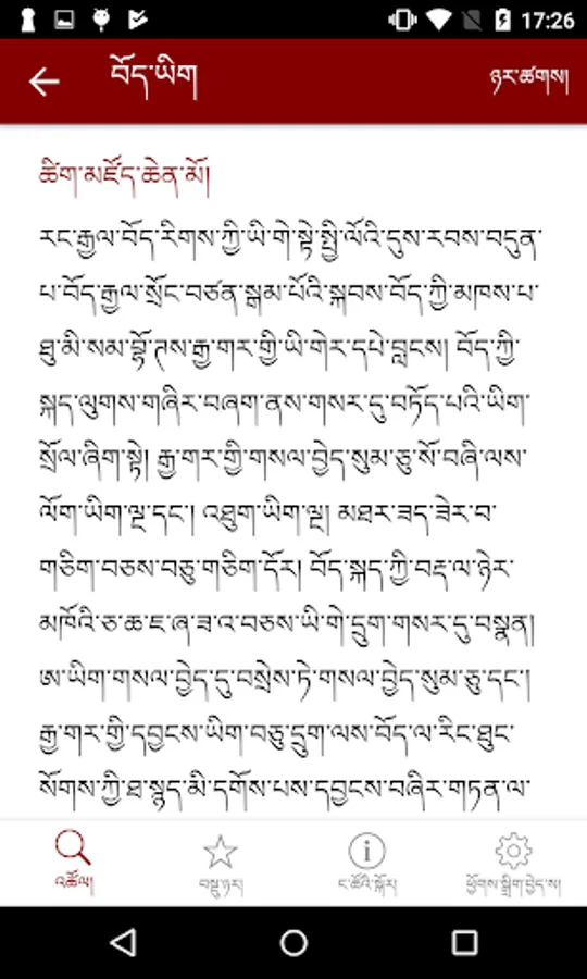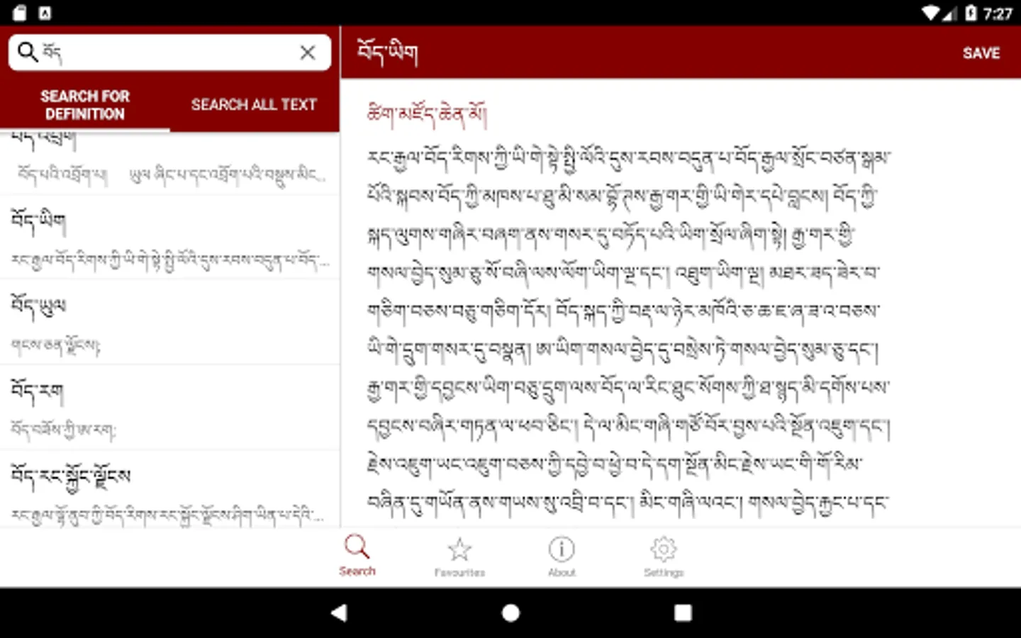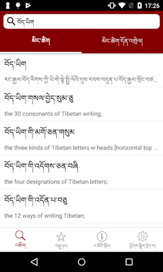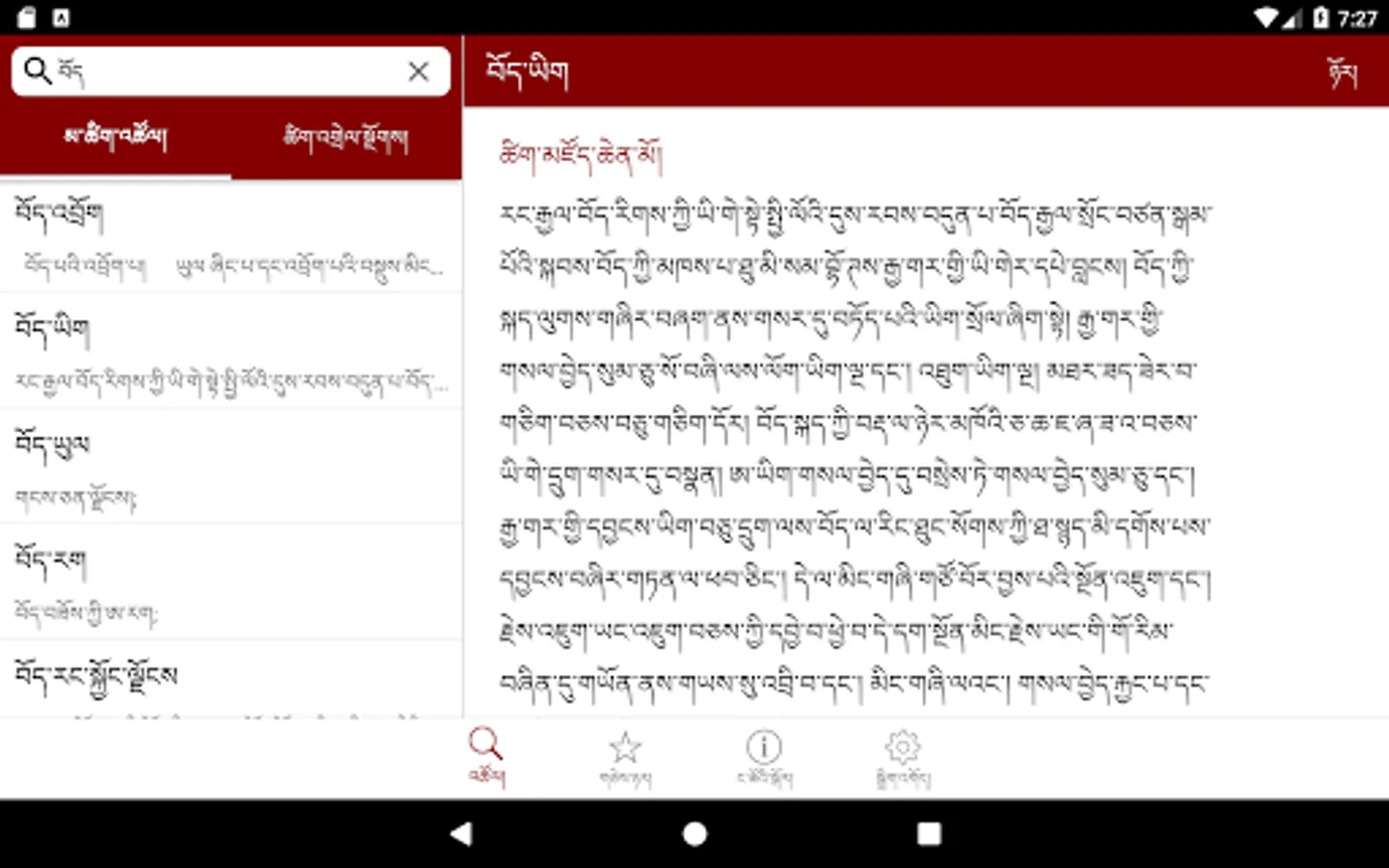 Note: a tibetan keyboard is required to be installed in order to search in tibetan. One is included in Android 7 and above; otherwise a third-party app will be required, such as Tibetan Keyboard by Iron Rabbit: https://play.google.com/store/apps/details?id=org.ironrabbit.bhoboard&hl=en