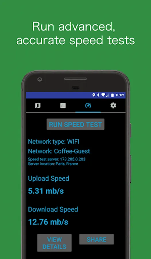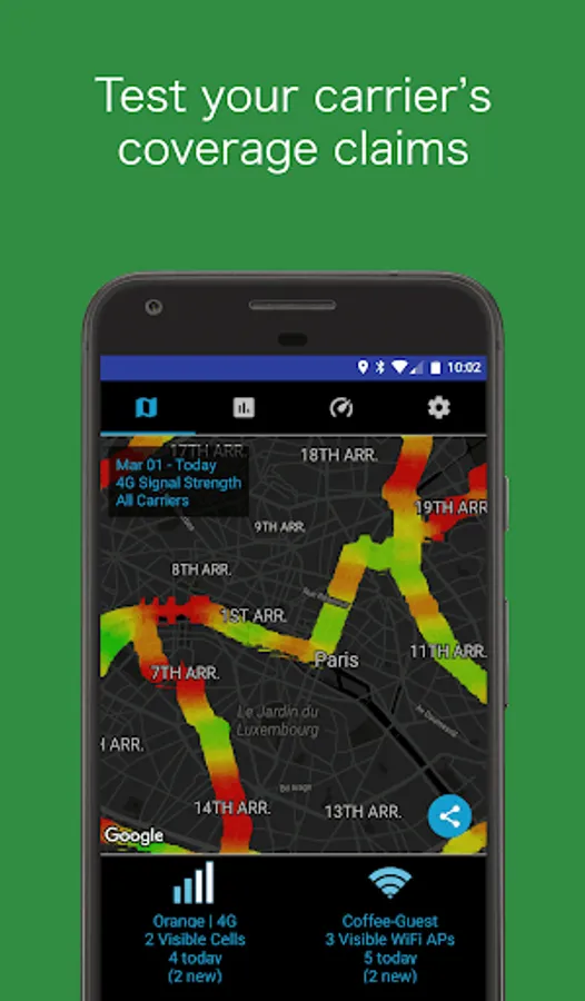 See where your device has better signal strength and where it encounters dead zones. Put your carrier's claims to the test by creating your own personal coverage map and by performing your own speed tests.