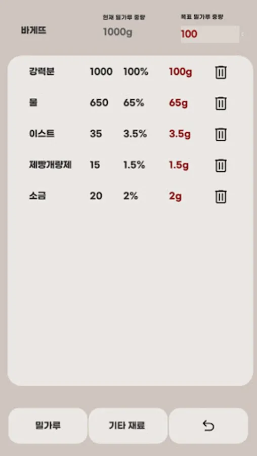 If you enter the weight of ingredients for each recipe, the percentage of that weight is calculated.