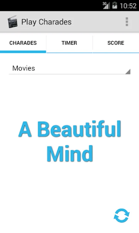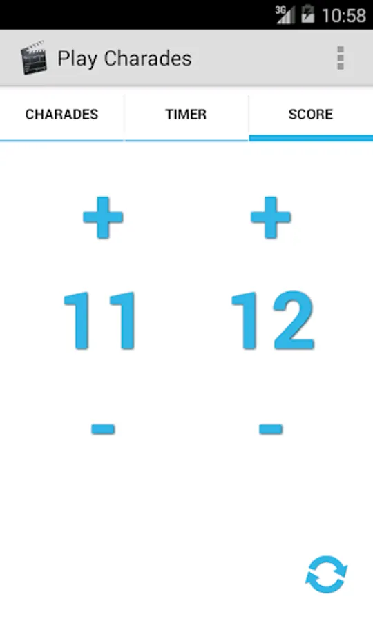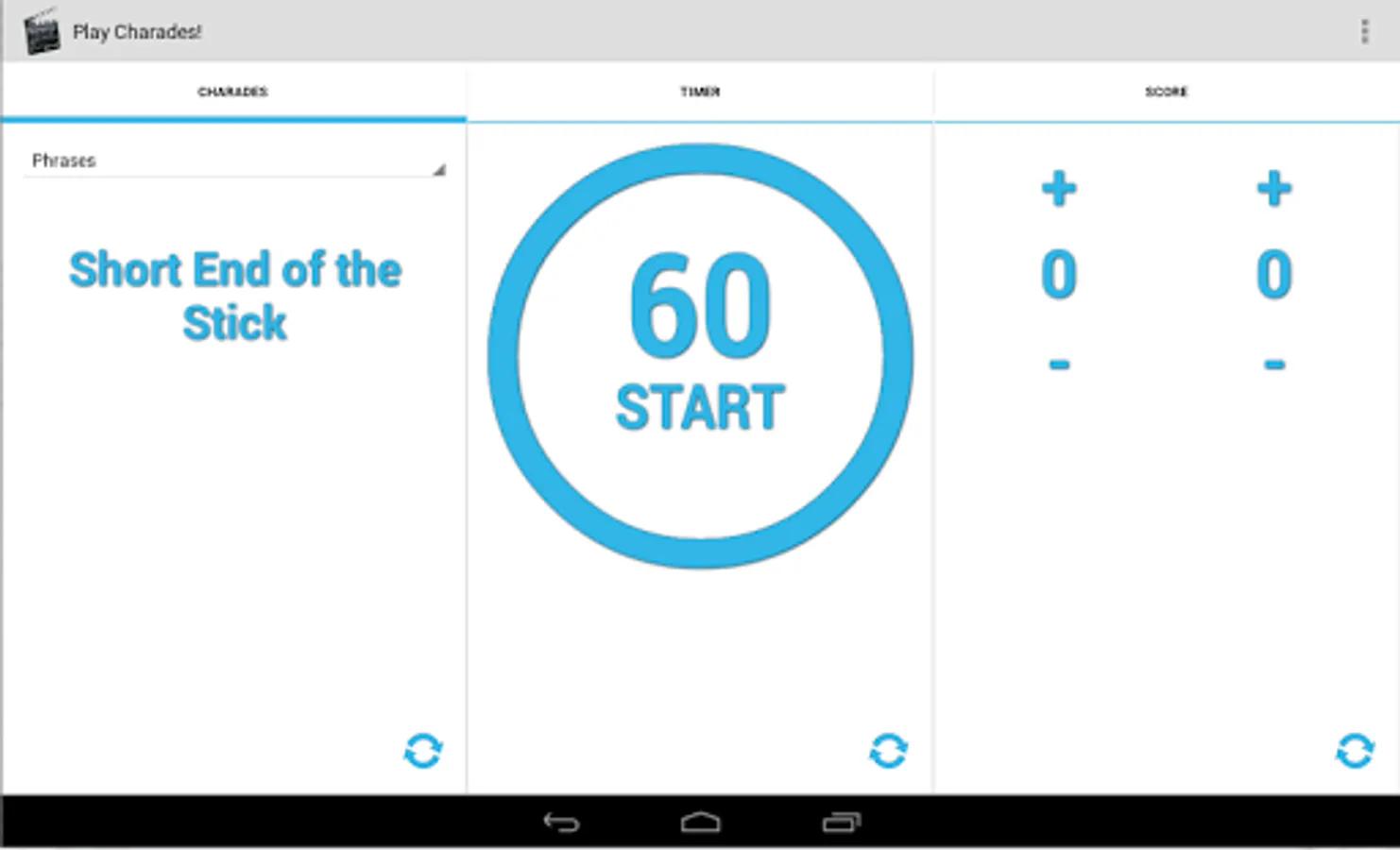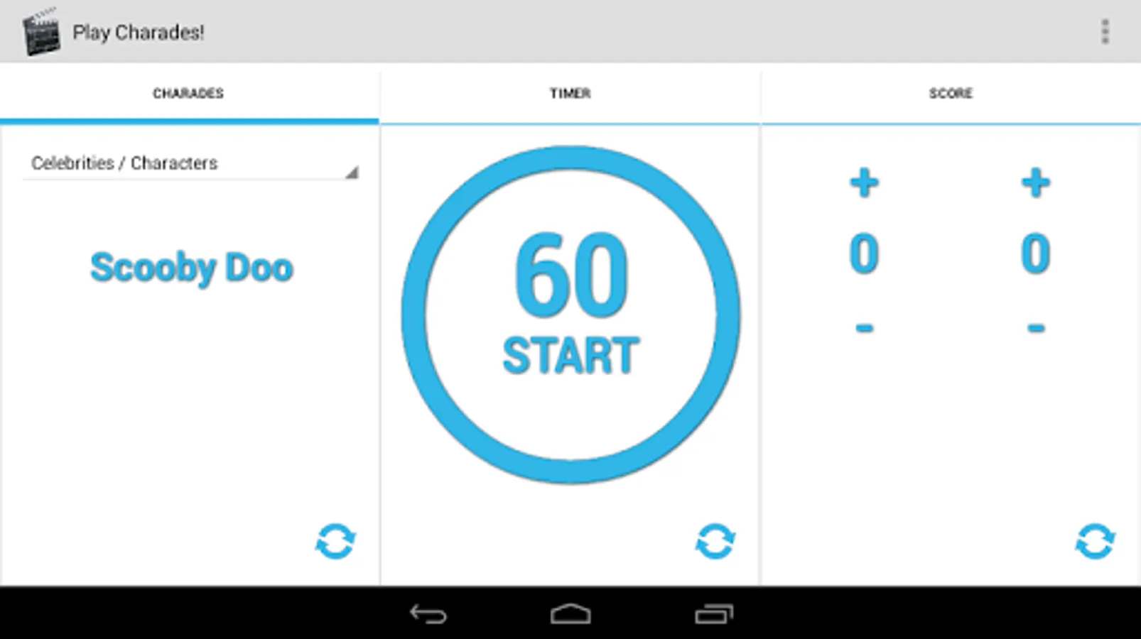 Charade generator, timer, and scoreboard for use when playing charades with family or friends.