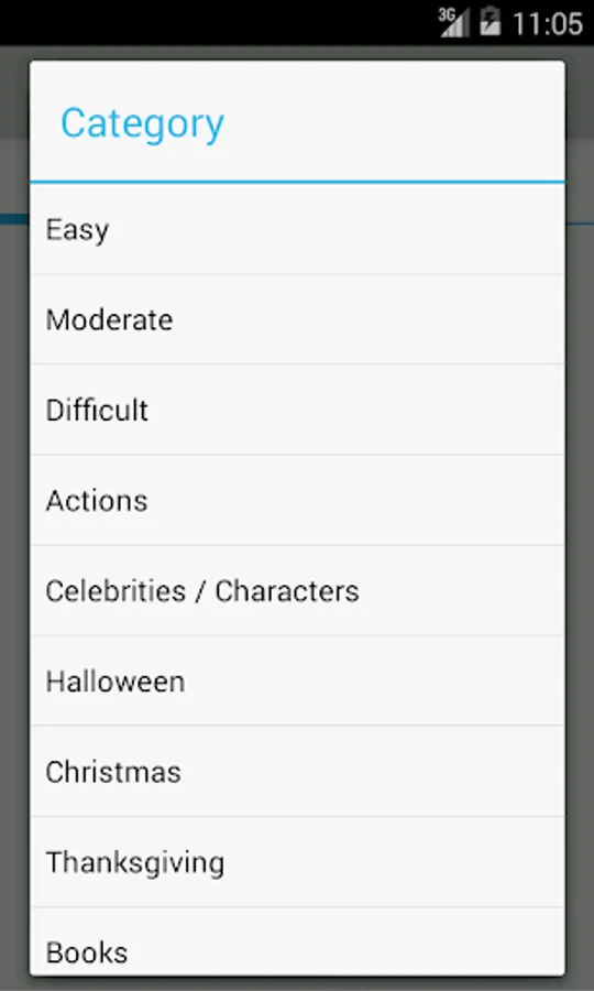 Categories: Easy, Moderate, Difficult, Actions, Celebrities / Characters, Halloween, Christmas, Thanksgiving, Books, Movies, Phrases, TV Shows, and Songs.