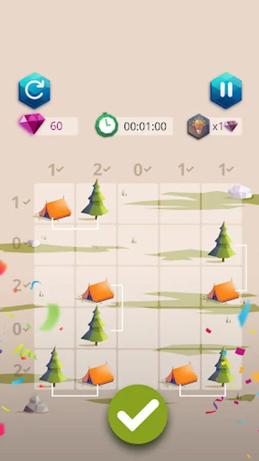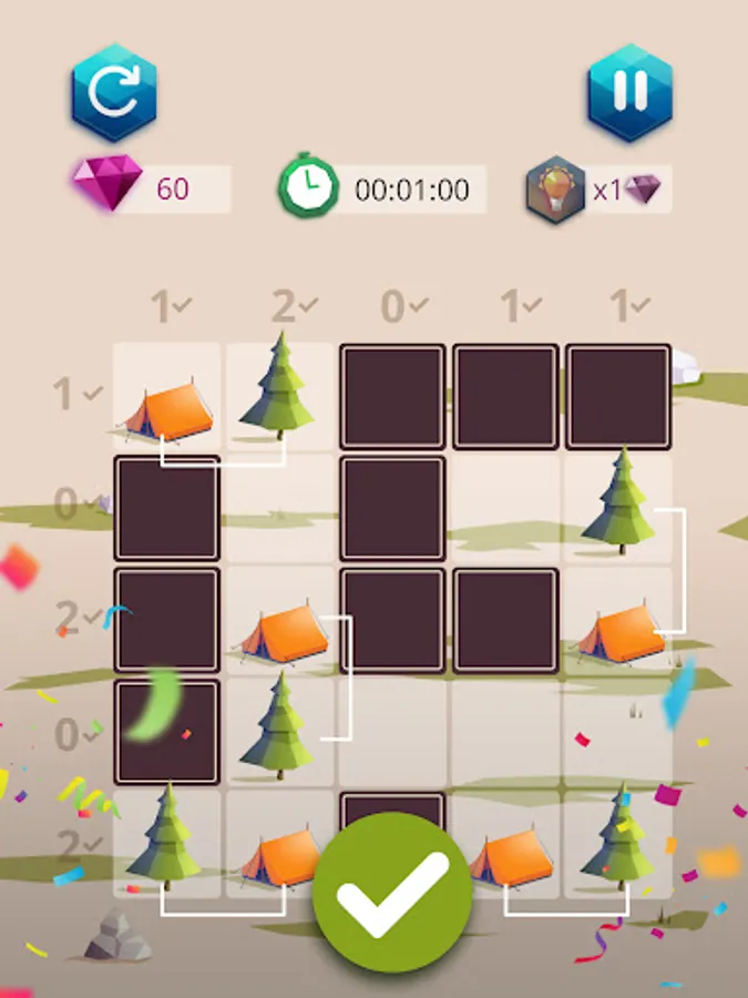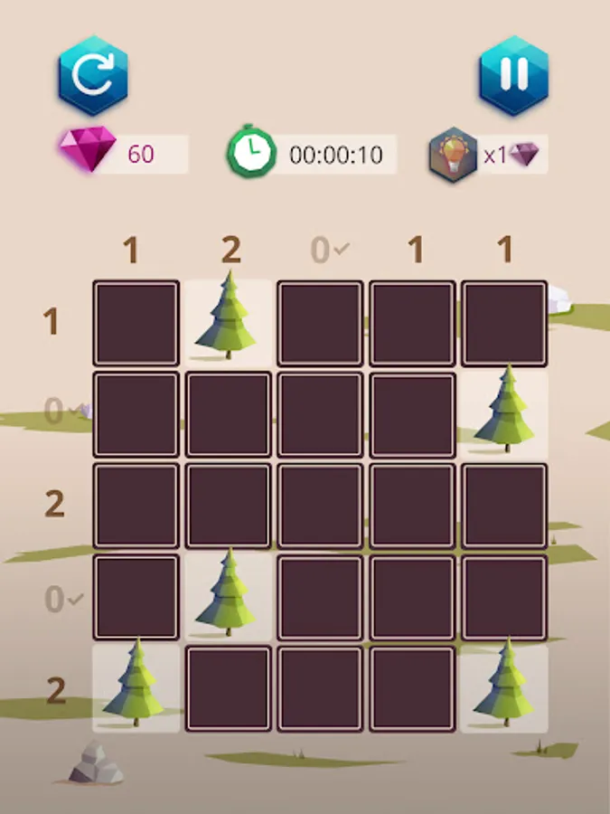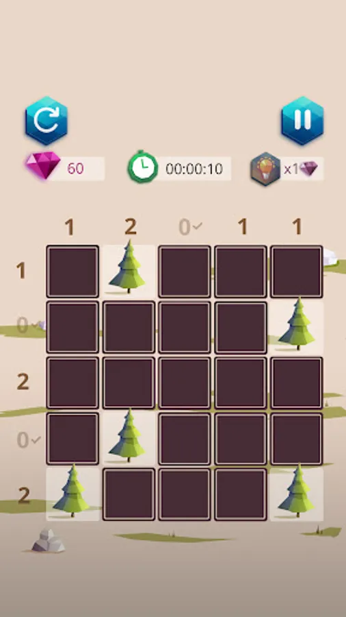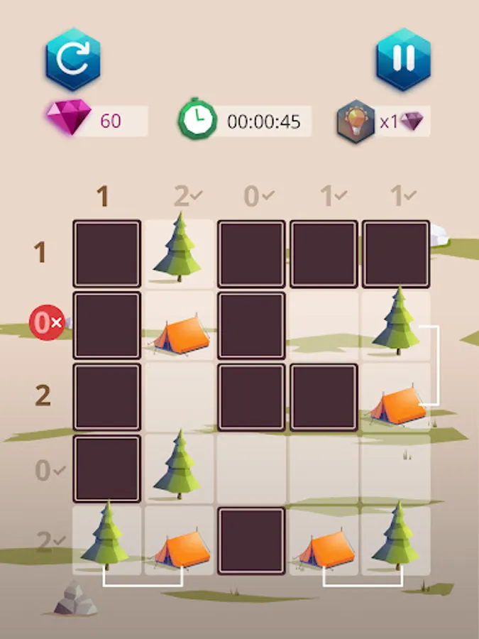 Camping master: tents and trees is a very simple game. You must place a tent next to each tree. The numbers around the grid tell you how many tents there are on each line. But be careful, 2 tents cannot touch each other...