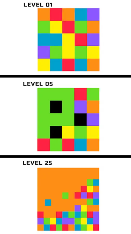 You are a colored square and you must clear the board. Change your color to add the surrounding squares to you. When there is only one color left, you win.