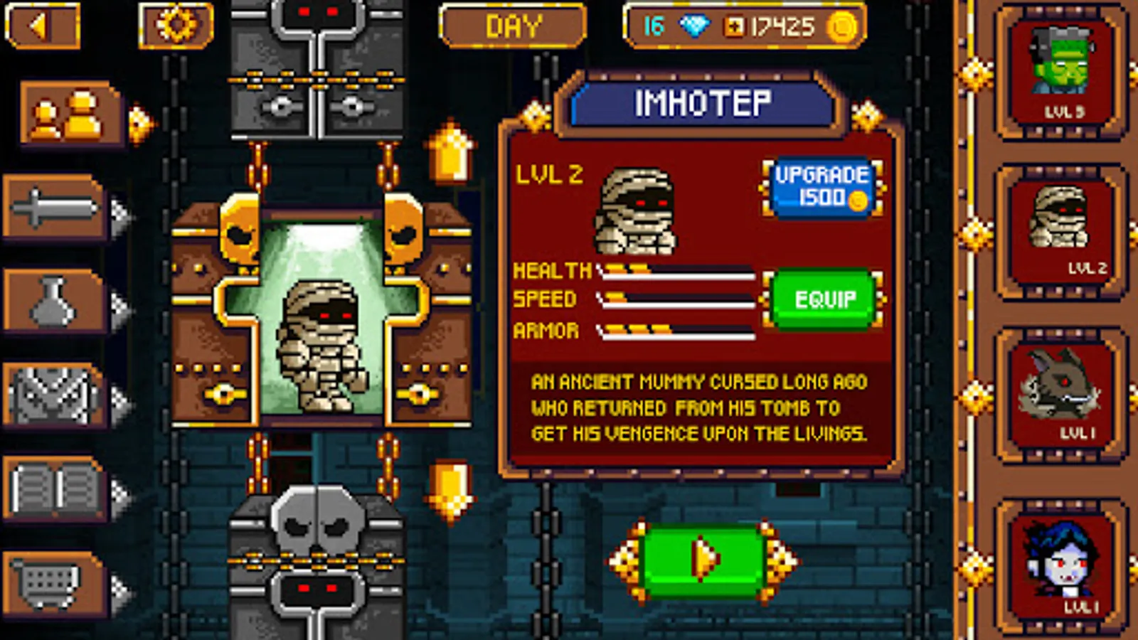 • 4 unique playable creatures: Dracula, Frankenstein, werewolf and the mummy.