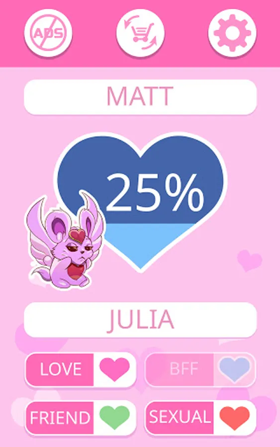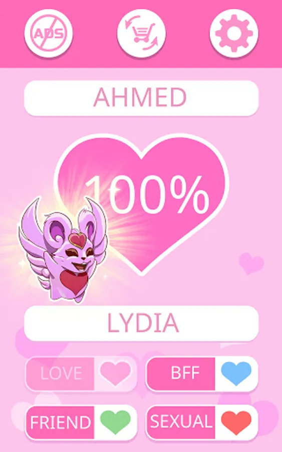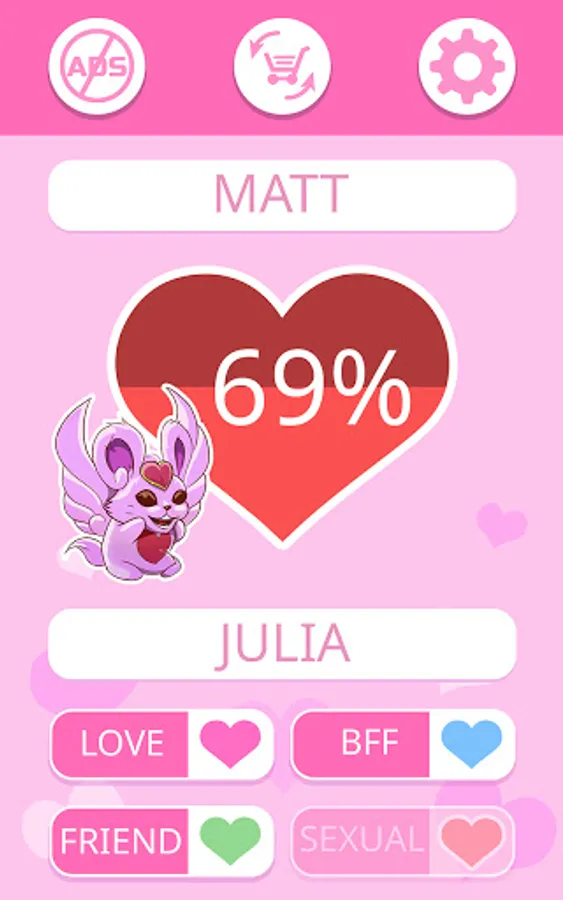 Are you in love or is it just friendship? Test your real love level thanks to LOVE TEST. Want to check other compatibilities like: friendship, Best Friend Forever, and even sexual compatibility? LOVE TEST is the calculator you need to get your answers