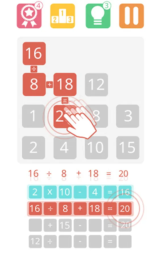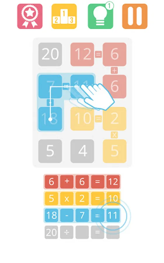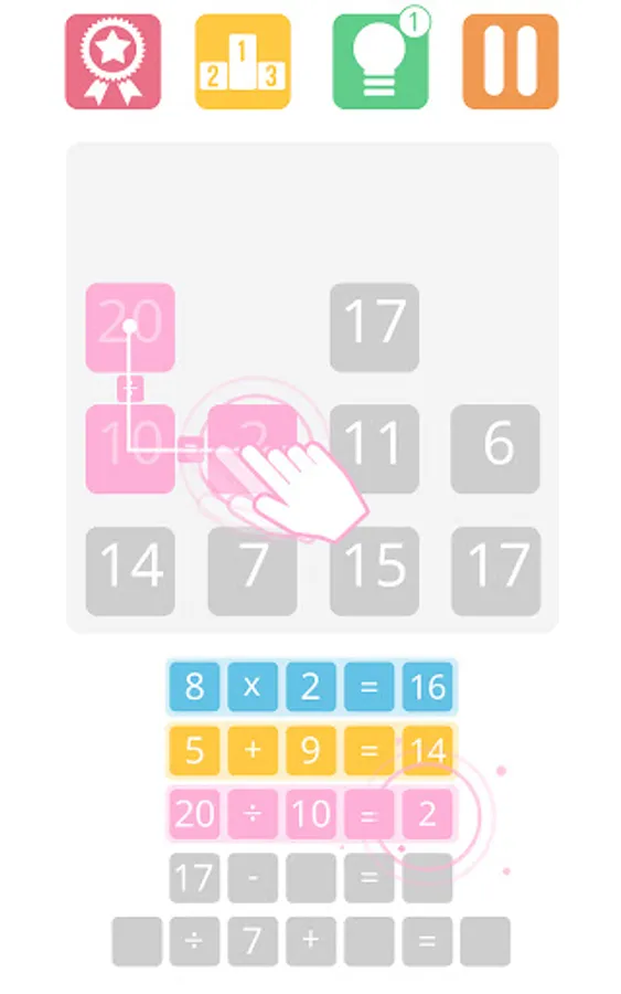 At the bottom of the screen you can see unfilled equations. The solution is on the top of the screen. Just link the correct numbers together so you can complete the equation.