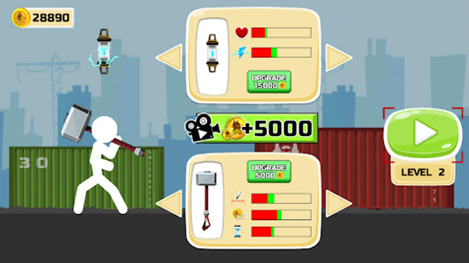 Lead your stickman to the final victory. You have a tons of different weapons available: swords, truncheon, thor's hammer, wraith scythe, unique cudgel, ali baba's tulwar, simbad's scimitar, grandpa's carbine", barana's star spike Mace, Gandalf's walking stick, bulgarian's umbrella, two handed mace, la guitarra, nimbus 3000 broom, decapitator heavy axe, ninja's bo staff, lancelot's lance, gladiator's sword, poseidon's trident, masters' sword, zangetsu, buster's sword, hattori hanzo's finest blade... and so many more