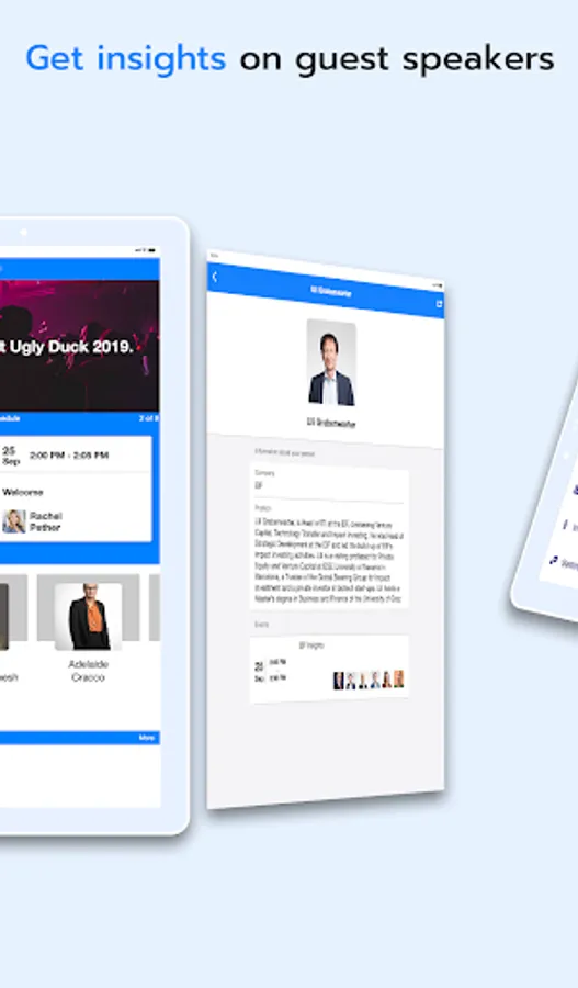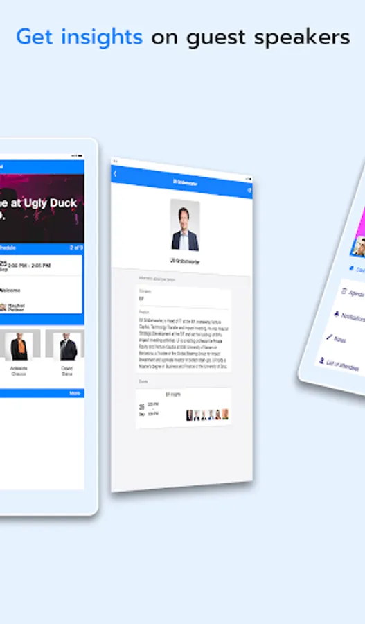 By following the agenda, you can review information about the guest speakers. Doing this allows you to access career information, biography, and other sessions.