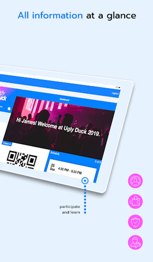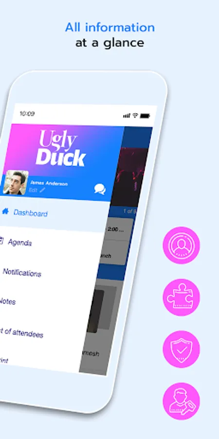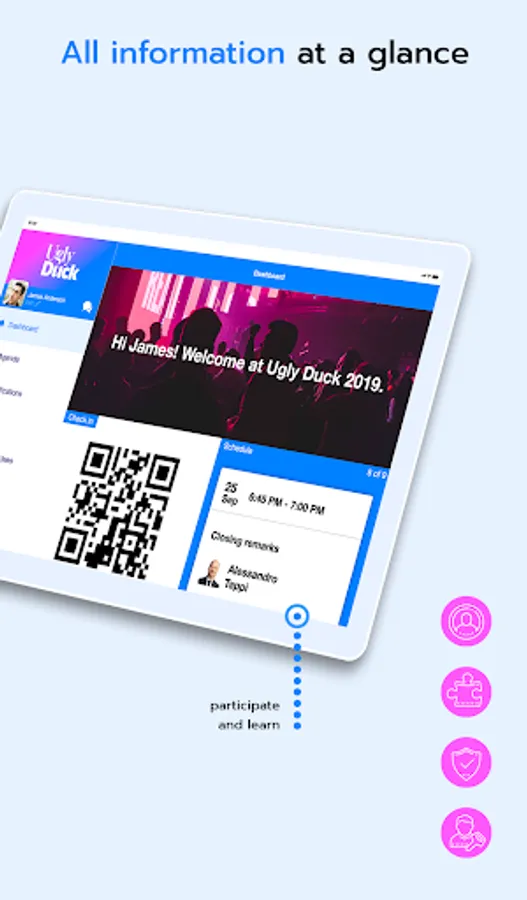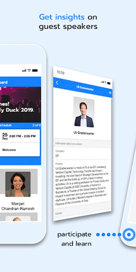Use the EIF VC Conf App to view current items on the agenda at any time, to retrieve profiles of other participants, to be up-to-date by push notifications or to network with the organizer and other guests through in app communication. The dashboard allows you to quickly and intuitively switch between different features.