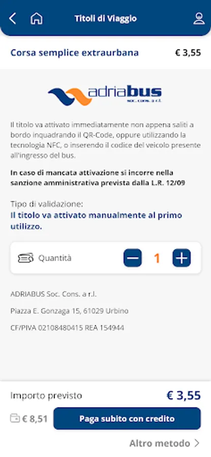 Buy tickets directly from your smartphone. You can pay by credit card or by loading the 'Credit Transport' by credit card, Satispay, PagOnline Unicredit or PayPal.