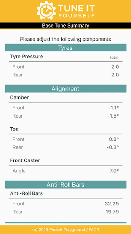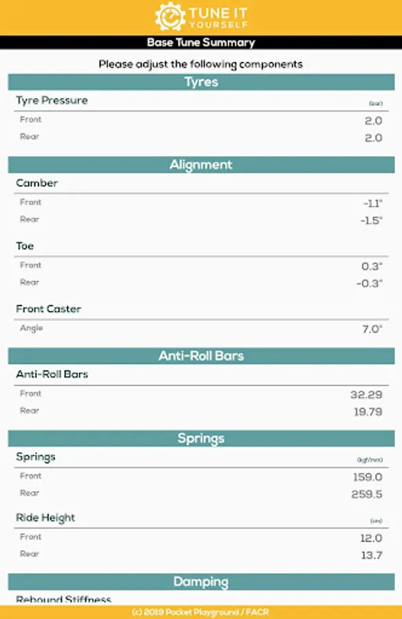 *Try it for free, full version requires a paid subscription*. Tune It Yourself makes use of the in game telemetry feed and advanced algorithms to tune each race car to the driver and circuit conditions.