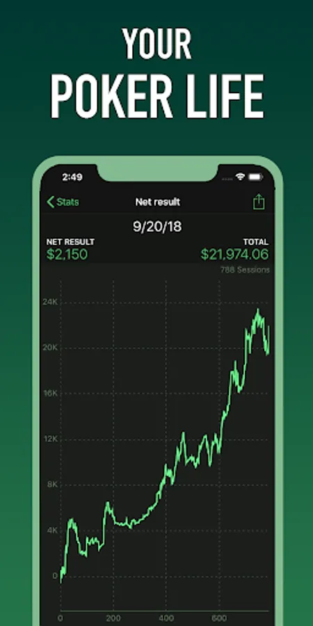 The app shows you all the key statistics from your cash games or tournament. See the evolution of your stats in beautiful graphs!