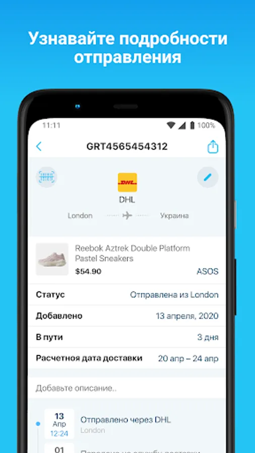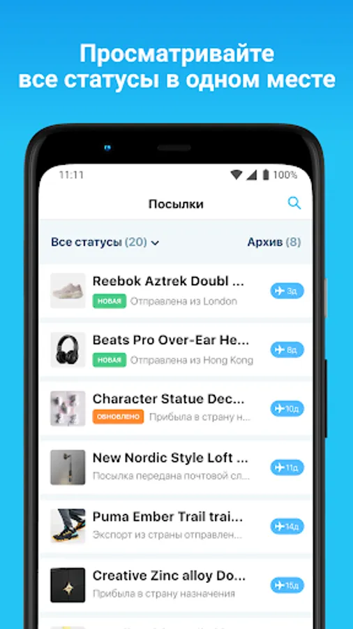 It is enough to install the free Posylka.net application on your mobile device, enter the tracking ID, and you will spend less than a minute on tracking parcels. All information about the location of your parcel is now in your smartphone only by the tracking code: find out how soon things or goods will arrive from China, Russia or other countries.