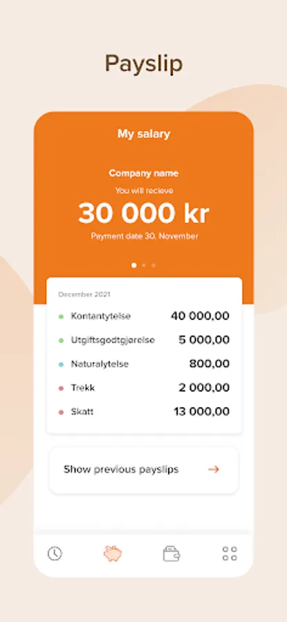 View your pay slip directly on your mobile. With the PowerOffice Go app, you will get an overview of your last pay, what you have been paid out as salary previously and an overview of important key figures. You can also export the pay slip as a pdf file, if necessary.