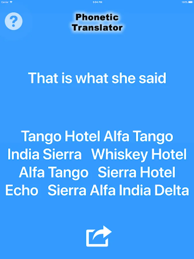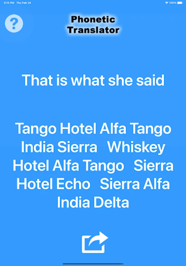 Type or paste in your words or phrases and tap "go" to turn "HELLO" into "HOTEL ECHO LIMA LIMA OSCAR"!
