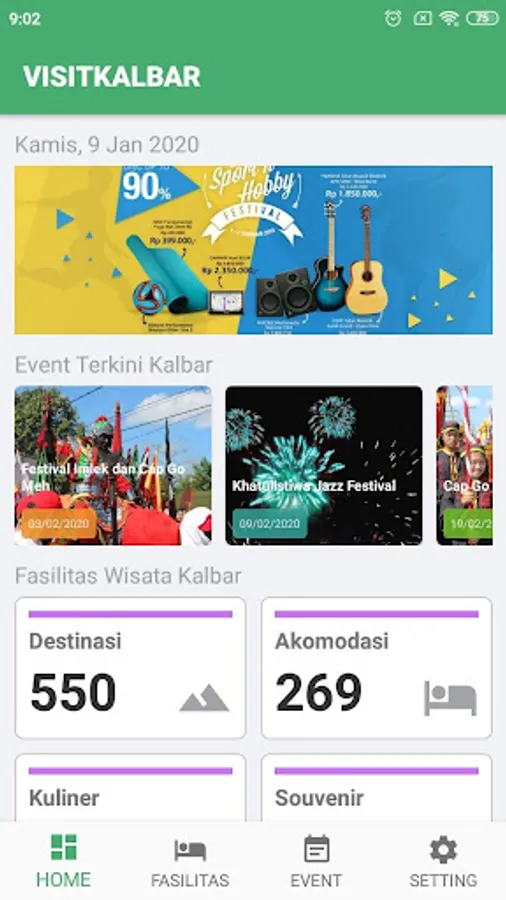 Kalbar Tourism is an application that manages the data of all tourism facilities (Destinations, Places to Eat, Accommodation / Hotels, Souvenir Shops, and Transportation) throughout West Kalimantan. Also available is an event calendar for tourism activities in West Kalimantan