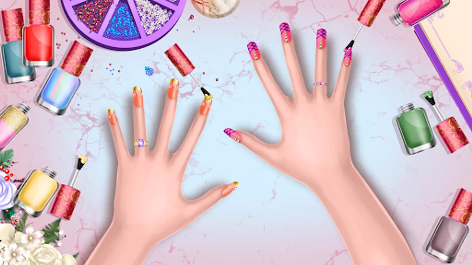 Enter the makeup salon with our bride and apply eyeliner, lipstick, mascara and other products. Match her makeup with her nails. Create a lovely manicure using pastel colors and sparkly decorations.
