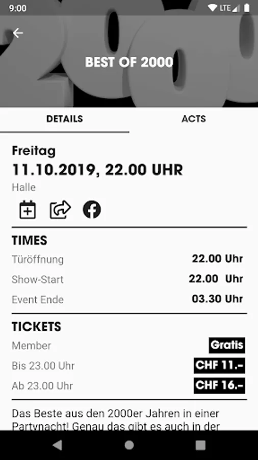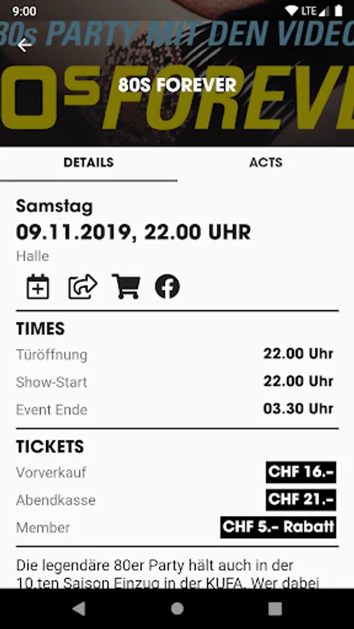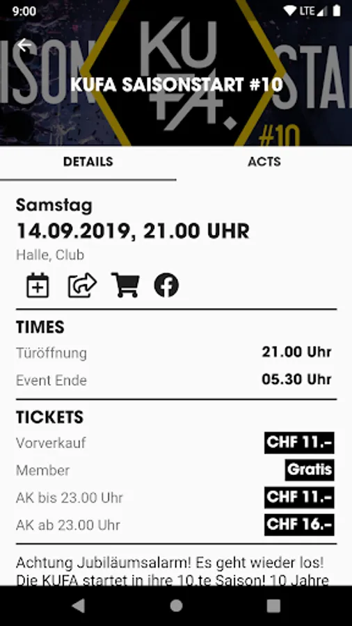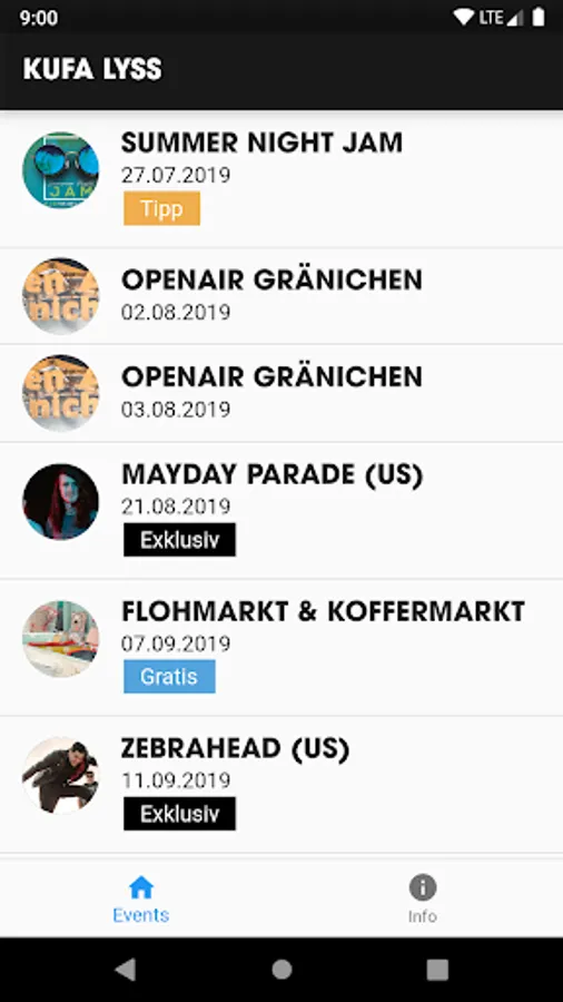 With the KUFA Lyss App for Android you have all the events in a clear presentation always under control, you can save them in your calendar, buy tickets directly for events, listen to the acts and visit their websites.