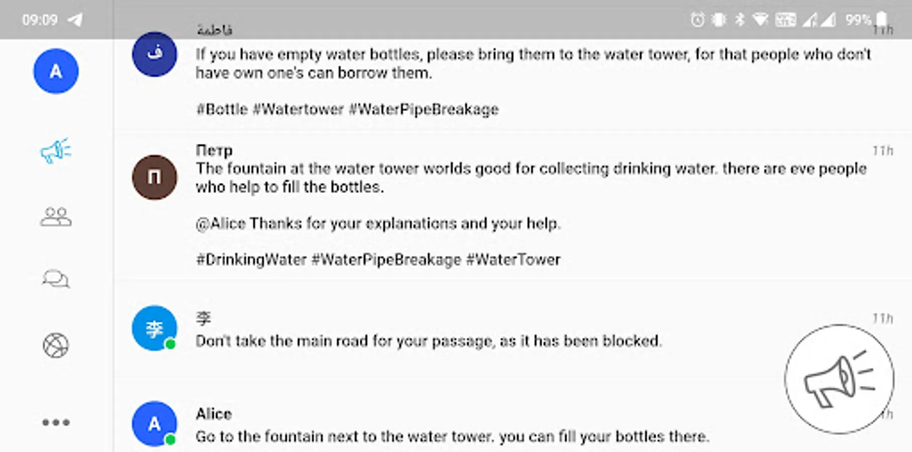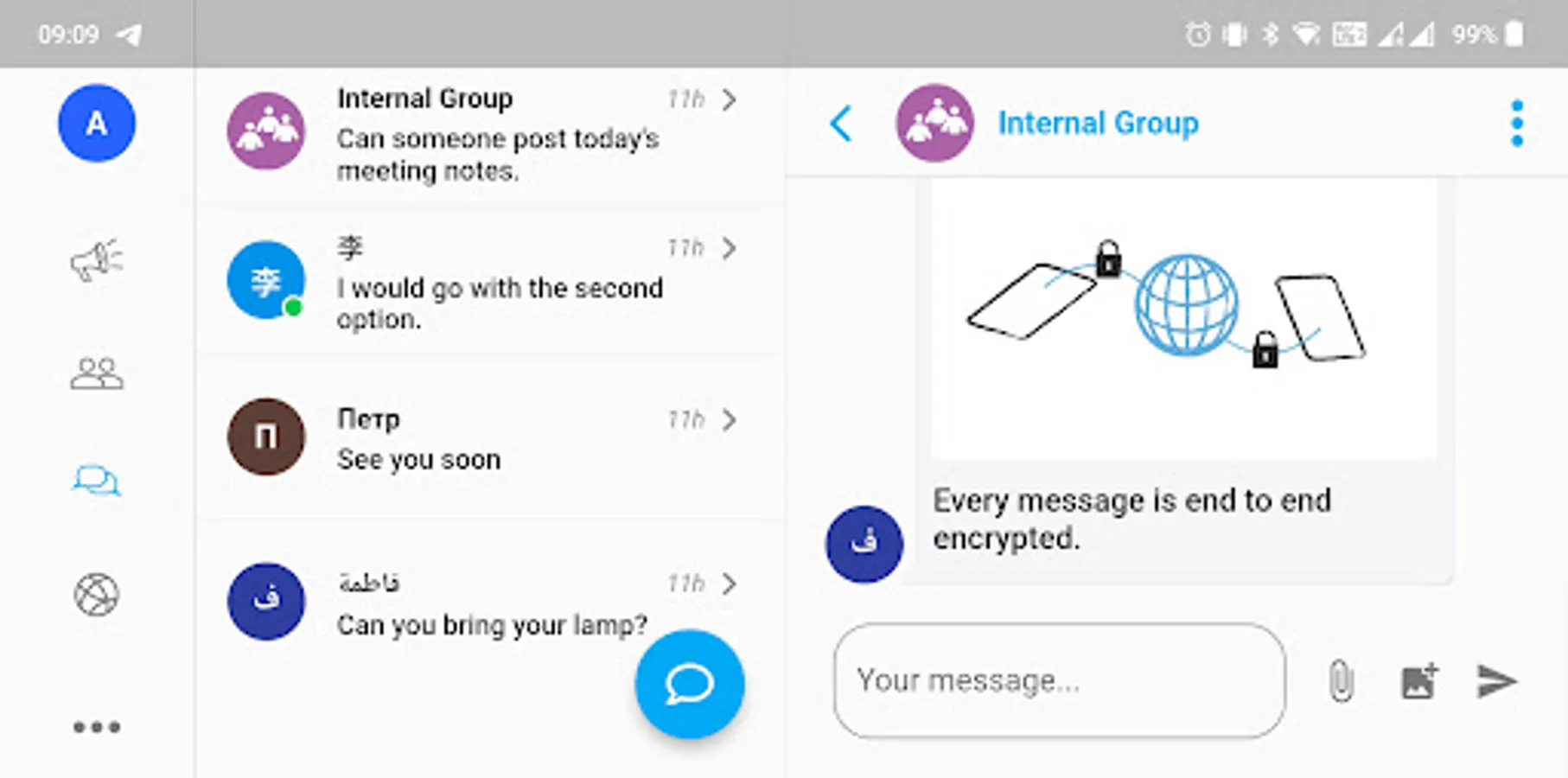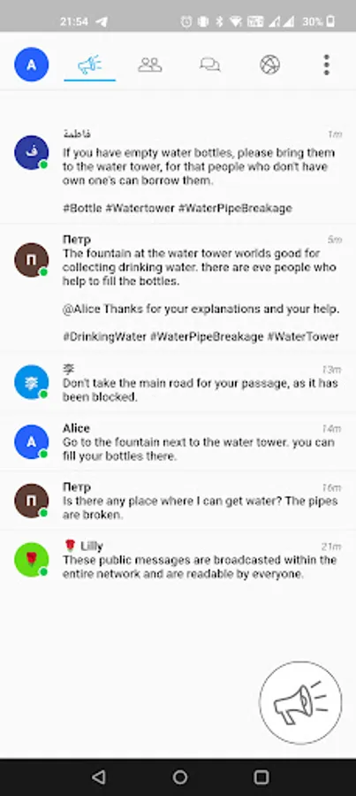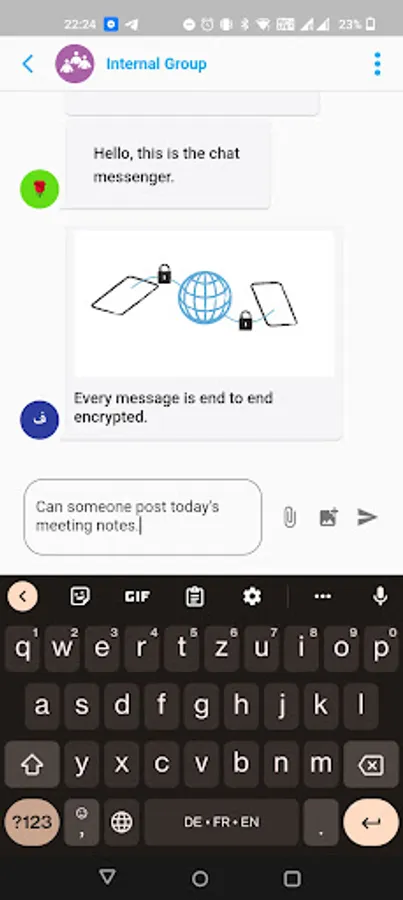 Automatically detect other qaul users nearby, broadcast public messages to everyone, create chat groups, send end to end encrypted chat messages, images & files.