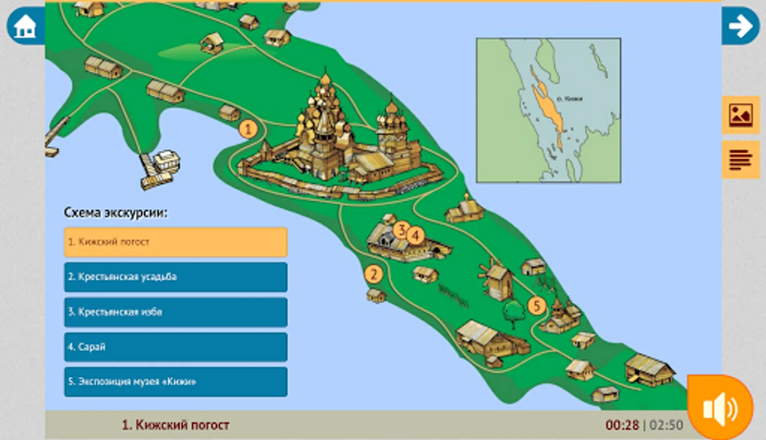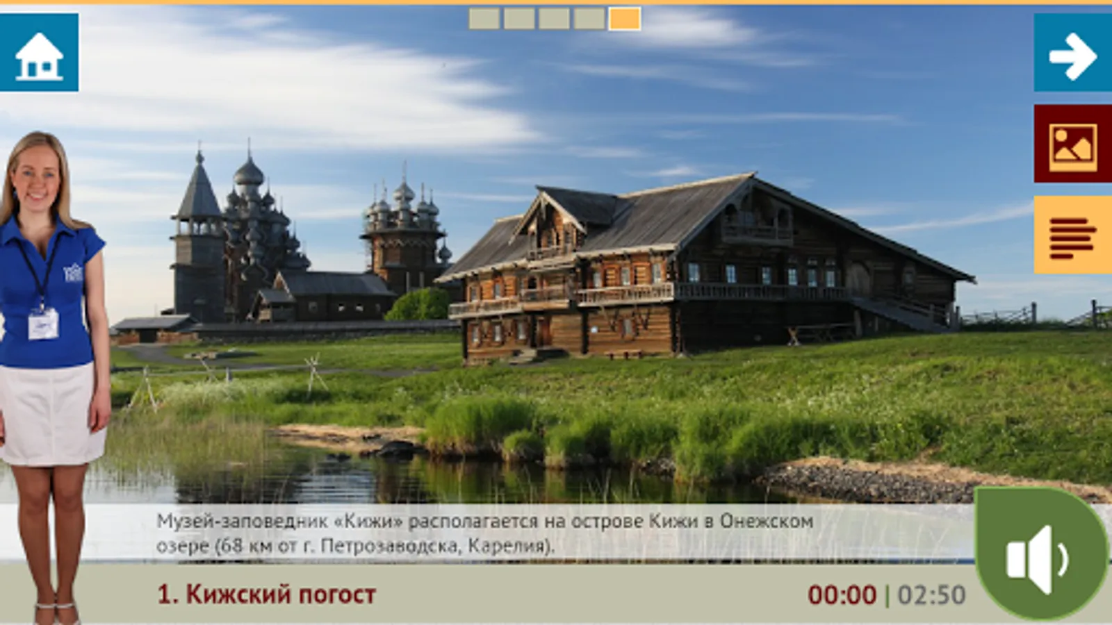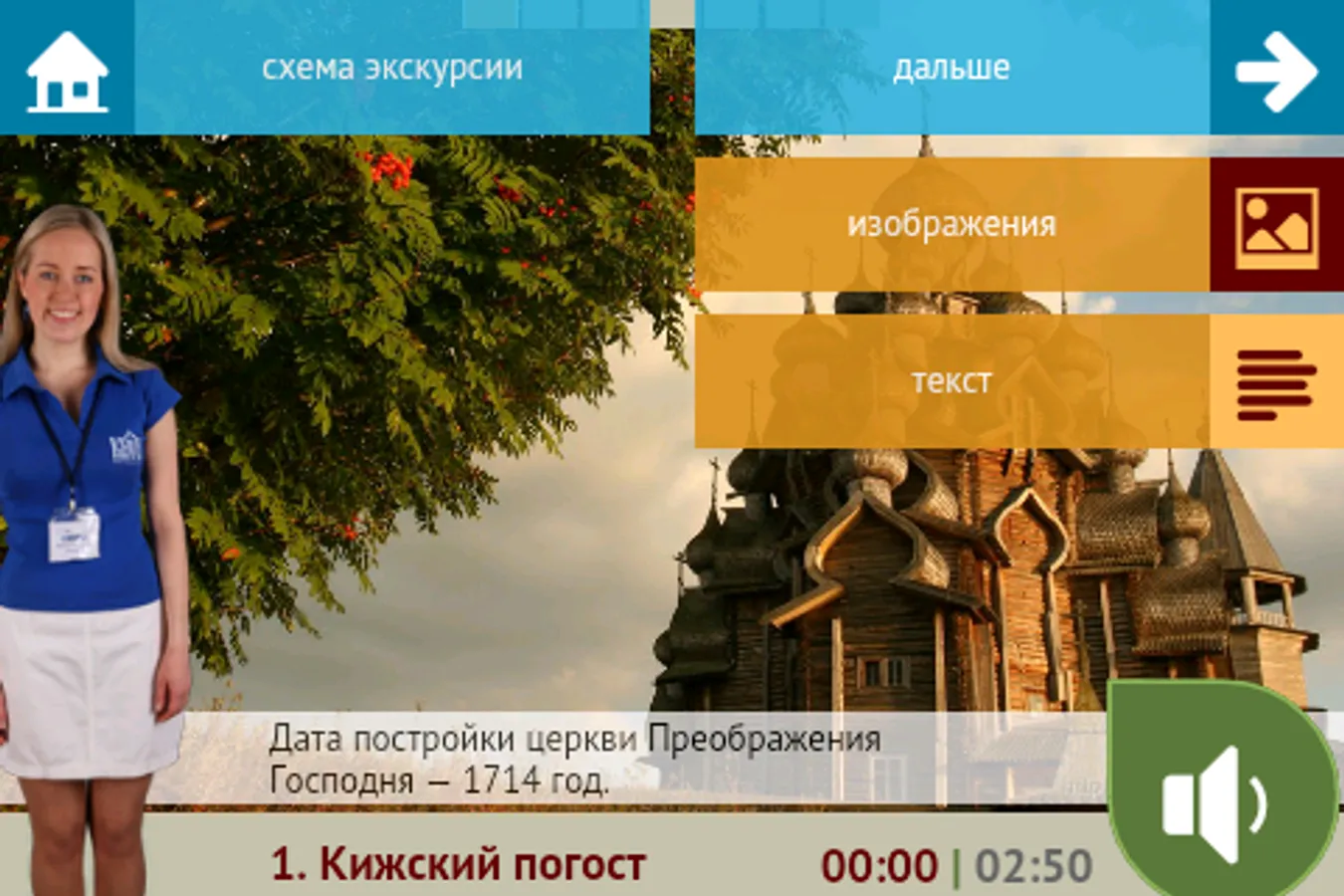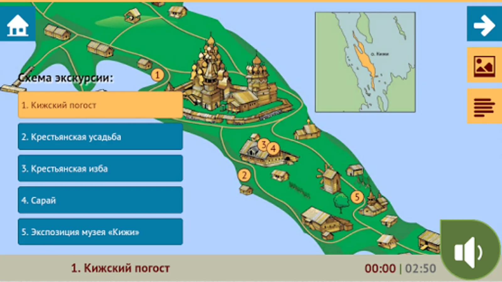 Duration of the entire audio tours - 12 minutes. During this time, you can get acquainted with the five themes: "Kizhi churchyard", "farms", "Peasant hut", "barn" and "museum exposition" Kizhi ". You can not only hear the story of Kizhi, but read it and see the slideshow of the best photos of Kizhi.