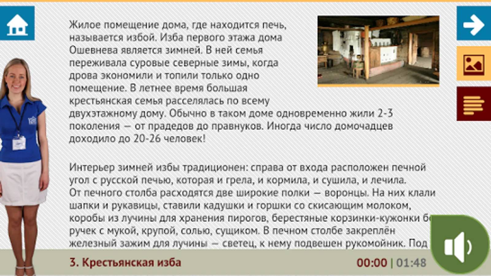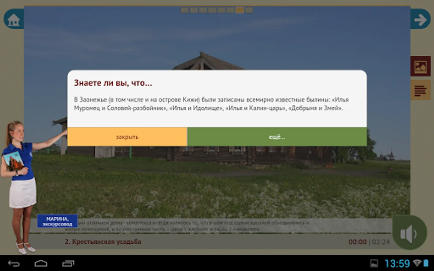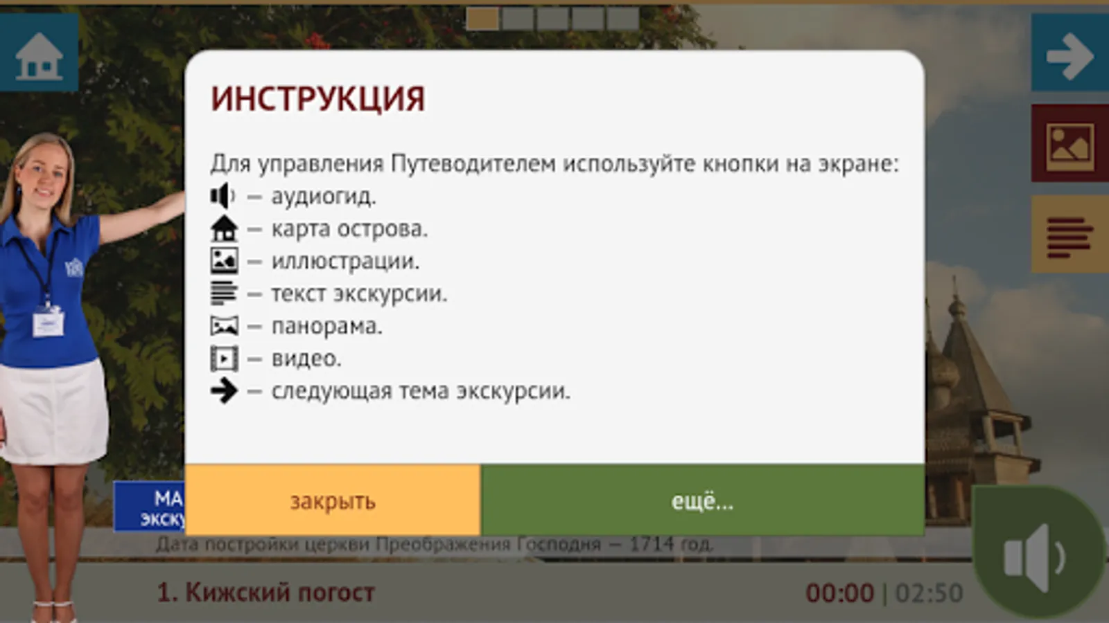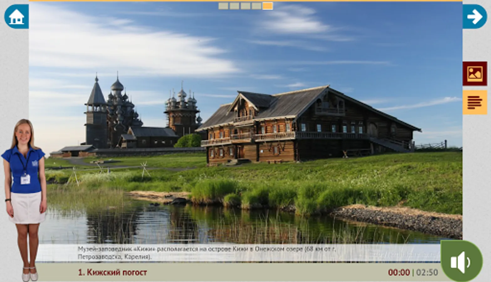 Duration of the entire audio tours - 12 minutes. During this time, you can get acquainted with the five themes: "Kizhi churchyard", "farms", "Peasant hut", "barn" and "museum exposition" Kizhi ". You can not only hear the story of Kizhi, but read it and see the slideshow of the best photos of Kizhi.