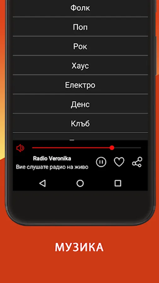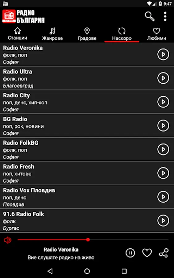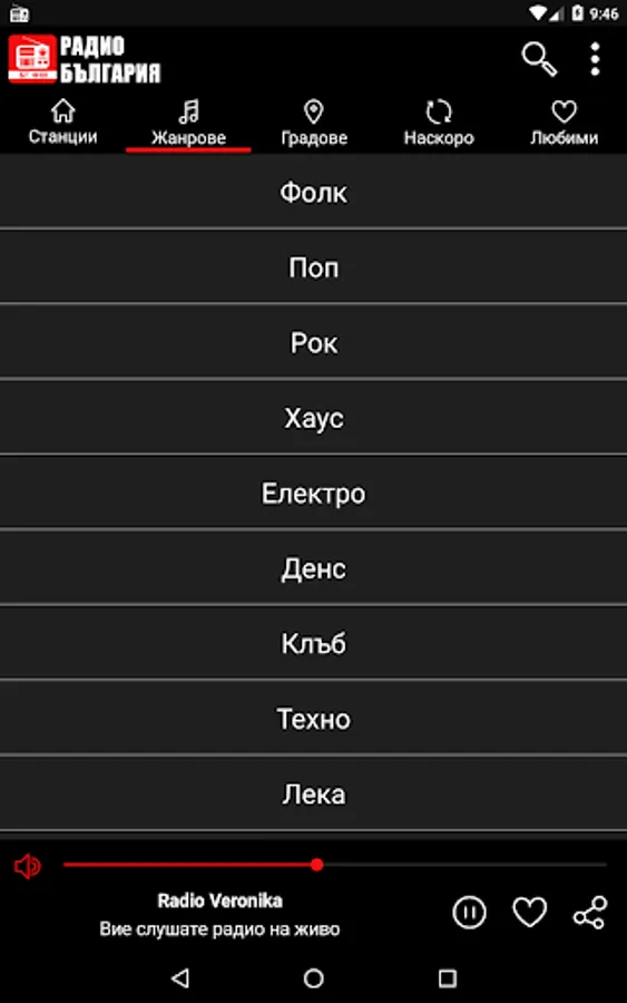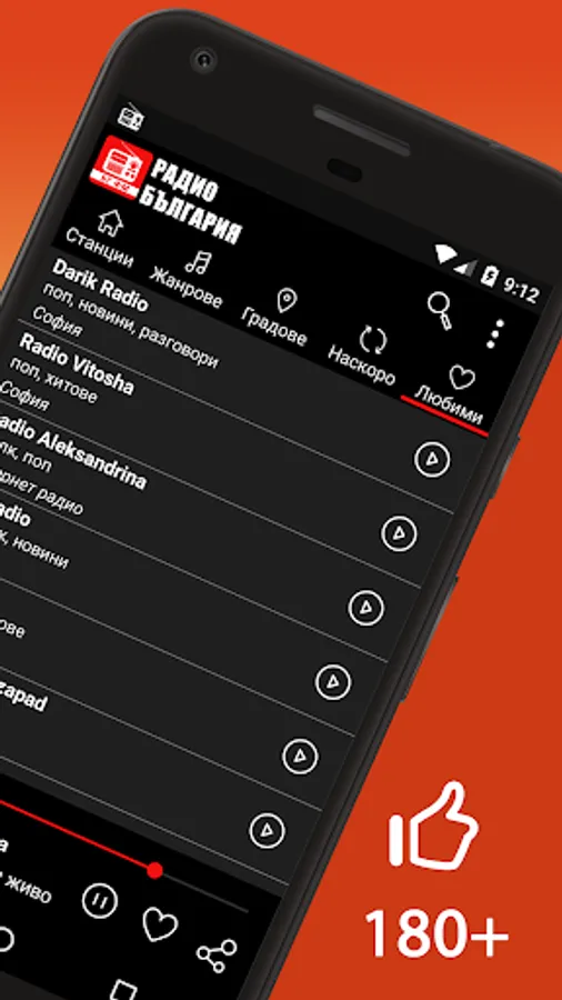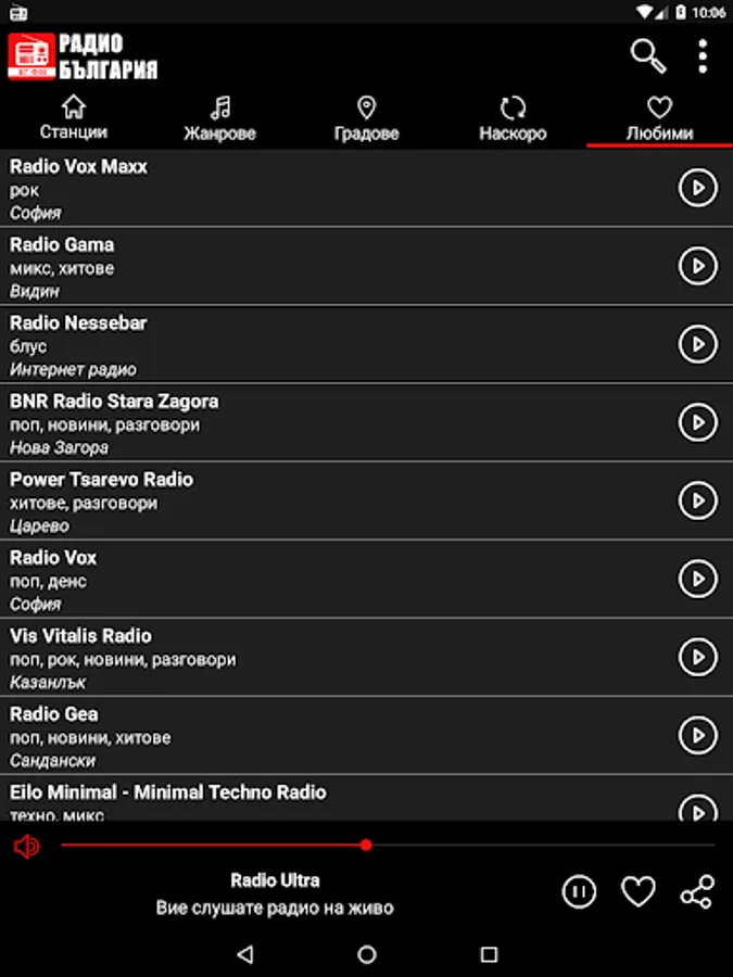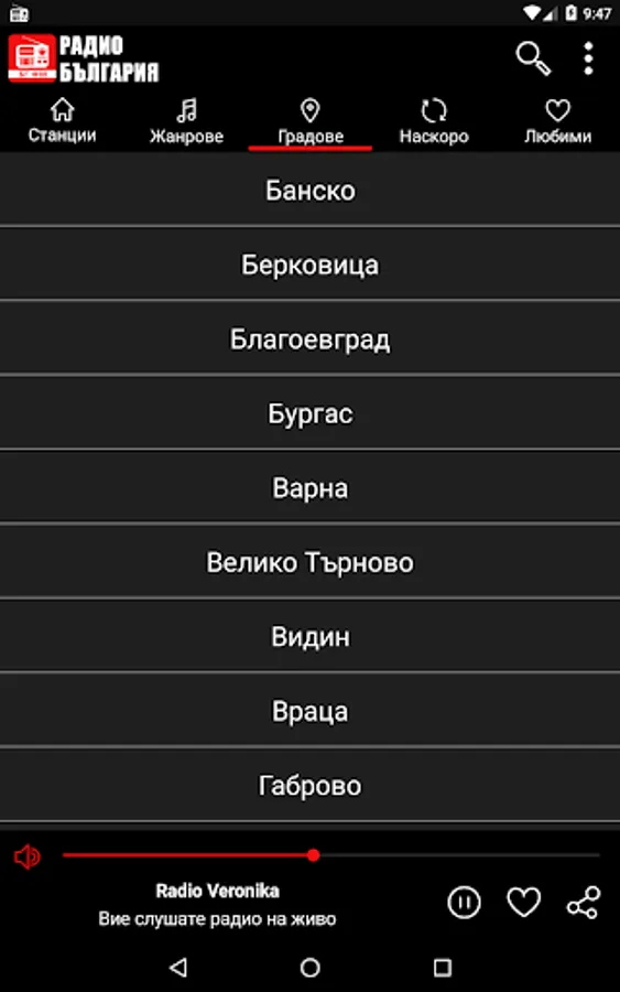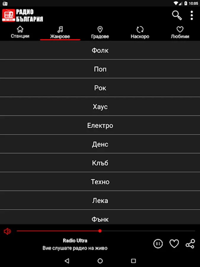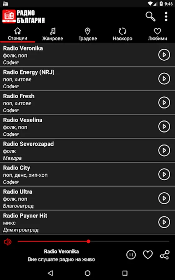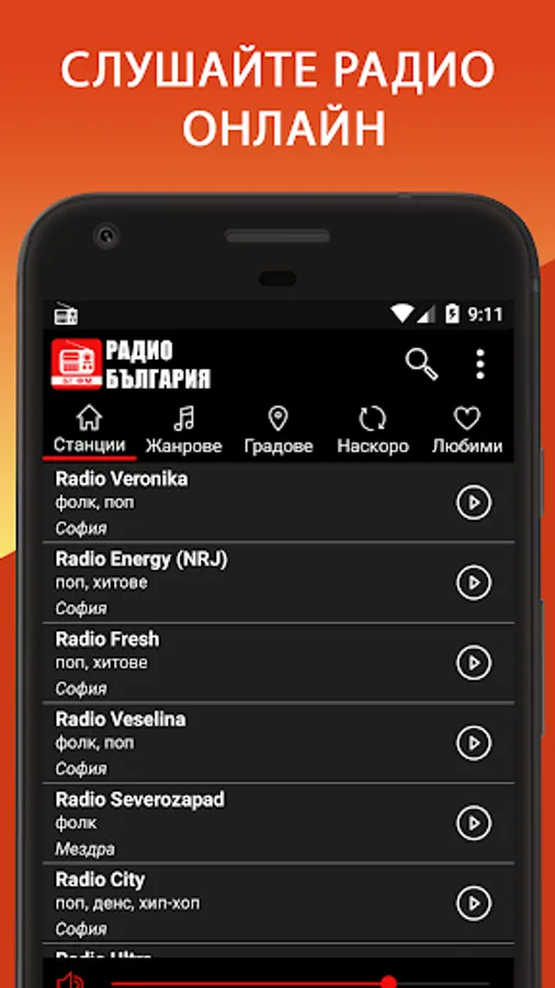 You can search the list of popular Bulgarian Radio Stations Online on your phone, choosing a city or genre. The list of radio stations is sorted by their popularity in the application. As soon as you select your favorite radio station and press "run", the application will continue to work in the background, while you will be free to use your phone.