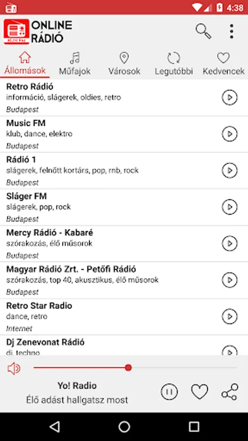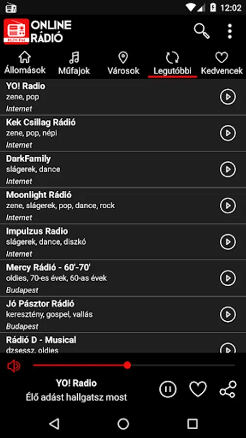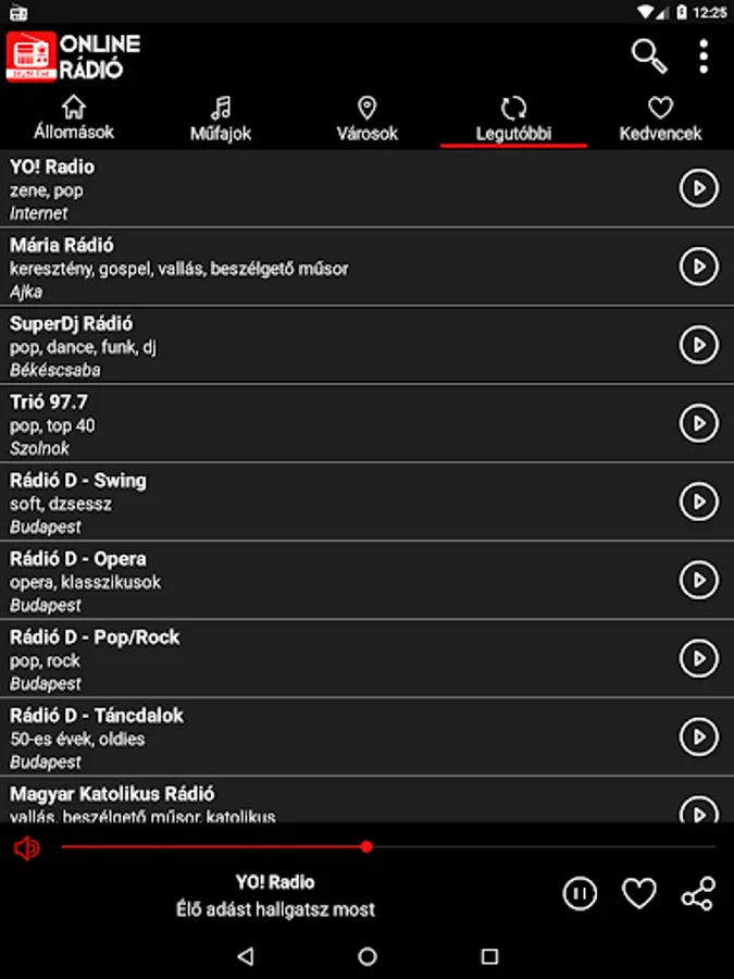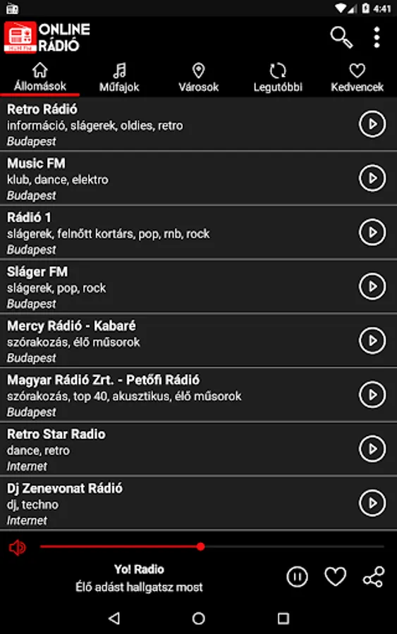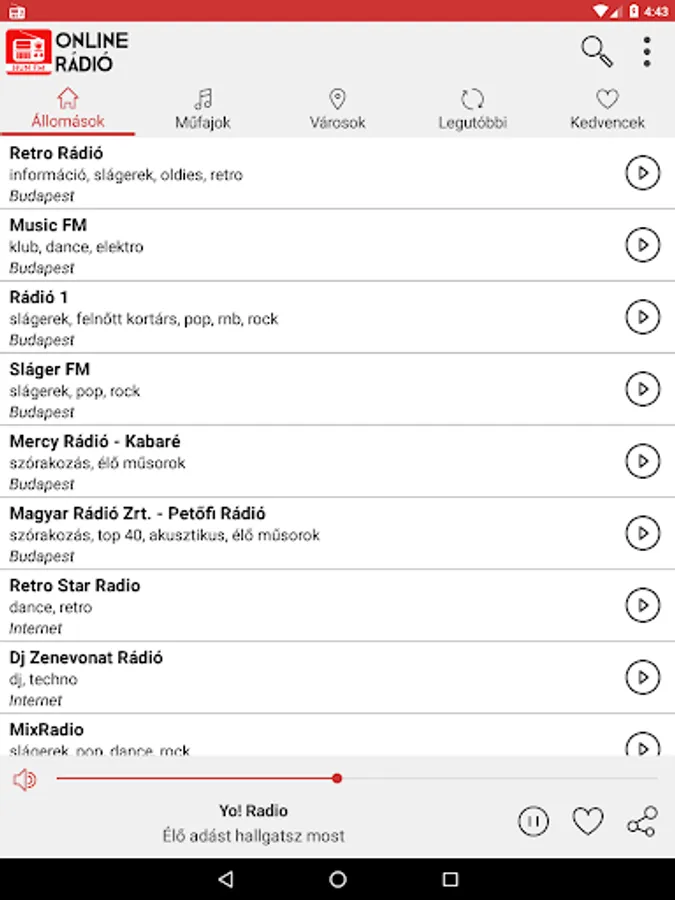 On your mobile phone, you can search the list of popular Hungarian radio stations based on criteria such as genre or city. Within the application, the list of radio stations is sorted according to the station's popularity. Once you've selected your favorite radio station and pressed play, the app will continue to run in the background while you're free to continue browsing on your phone.