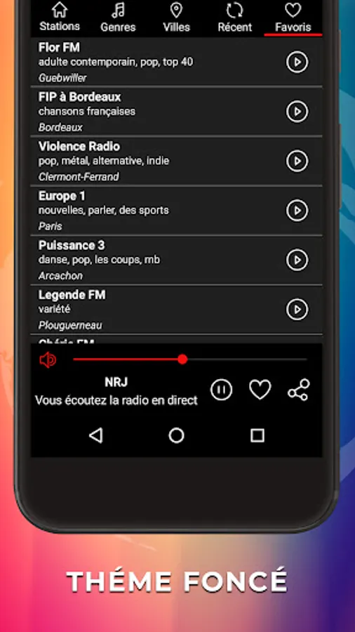 Popular France radio stations on your cell phone can be searched by genres or cities. The list of online radio stations is formed according to listening in the app. When you select your favorite radio station, leave it and the app will stay in the background while you do other things on your phone.