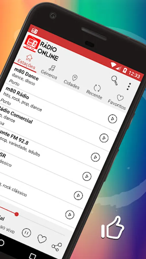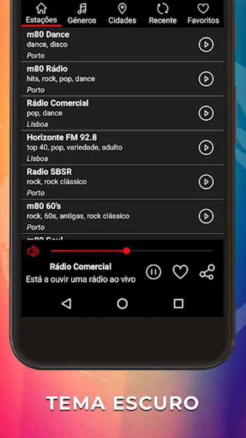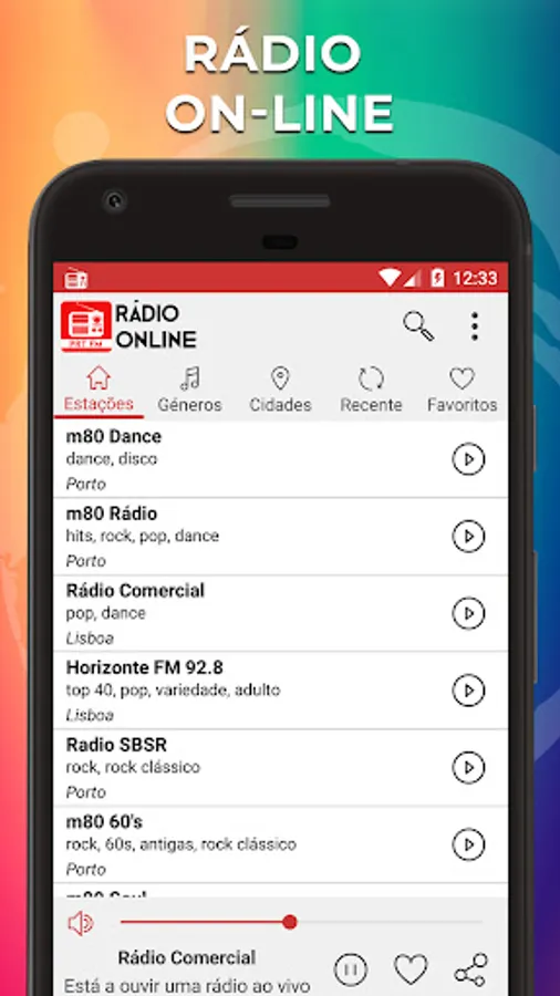 You can search the list of most popular radio stations in Portugal from your mobile phone using criteria such as genres or cities. The list of radio stations will be organized according to the popularity of the stations within the application. As soon as you select your favorite radio station and press play, the application will be working in the background and you can continue browsing on your phone.