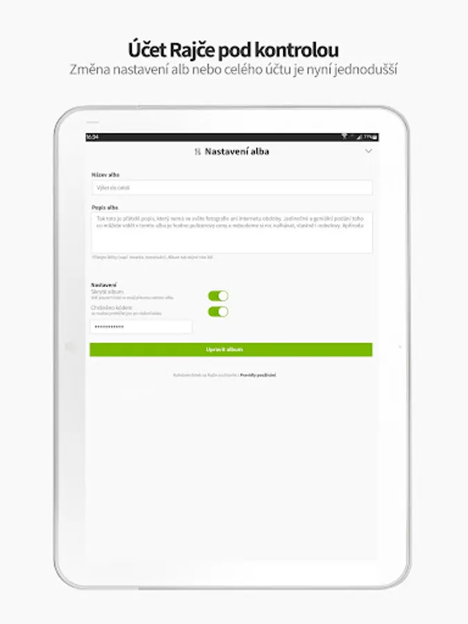 SEE YOUR WORKS ANYWHERE: You still have an overview of your albums. You can quickly and easily change their basic settings such as create a new album, hide or password an album, change the description or name of an existing album, delete an album, and so on. connection, for example, on a television.