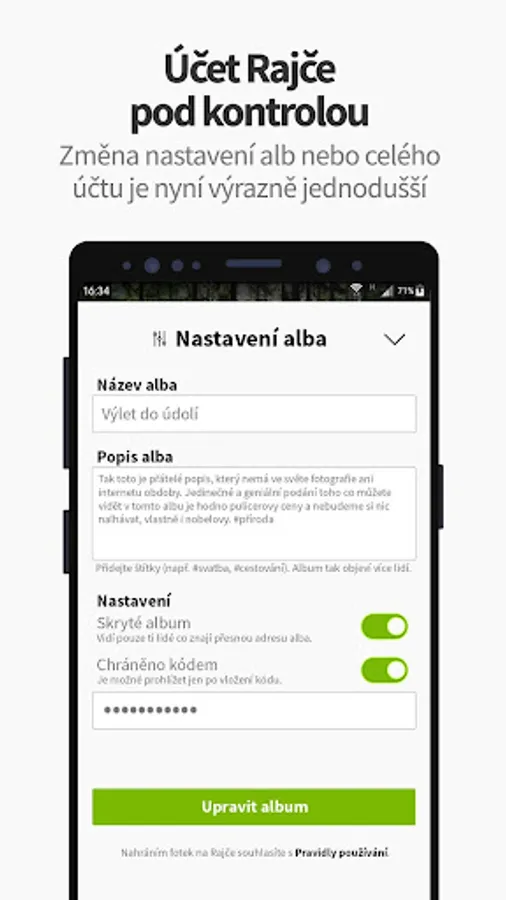 FREE ACCOUNT AND SPACE: You don't have to worry about running out of space. You have unlimited space for your photos and videos at Rajceta for free. It can be used even if you run out of space on your mobile. Note, however, that Tomato is not a backup service and that photos or videos may not be uploaded to Tomato in its original quality and resolution.