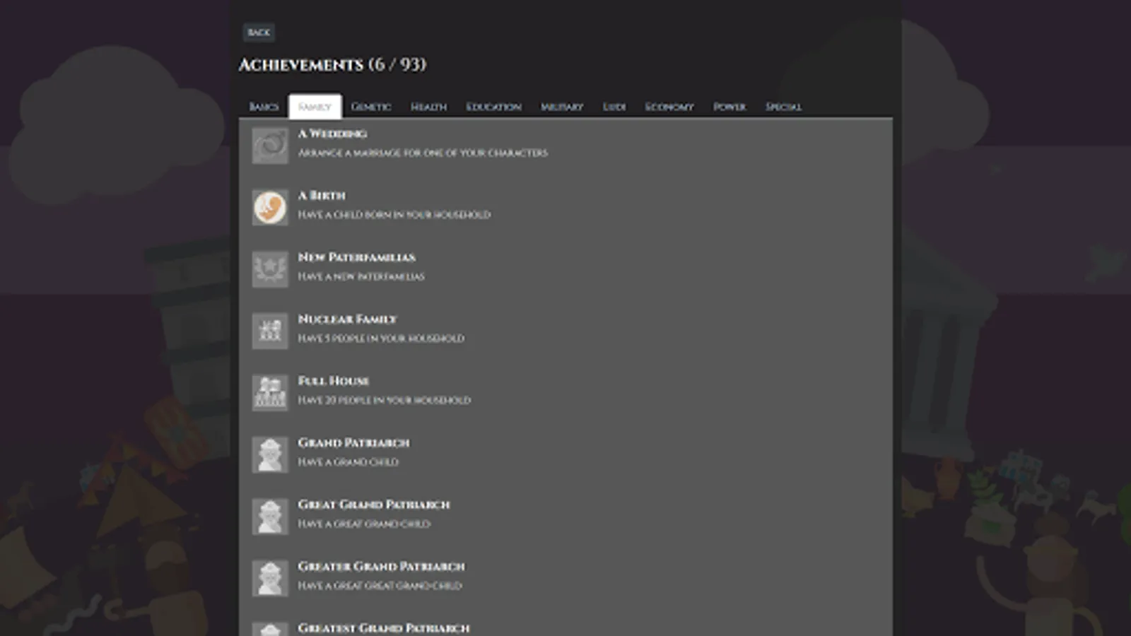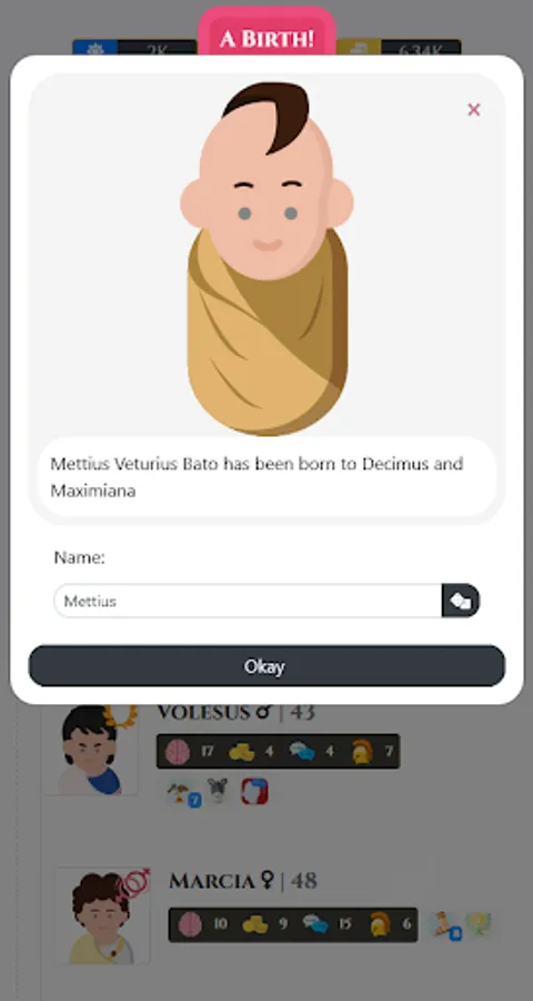 • Full life sim with: Marriage, Birth, Health/Illnesses, Death, and Succession